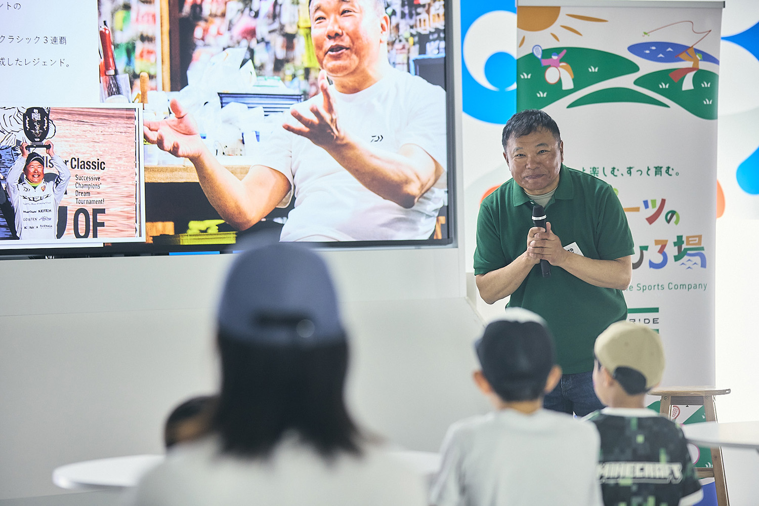 本イベントの講師として登壇されたのはフィッシングプロアングラーの赤羽修弥(あかばね・しゅうや)氏。ご自身の長年の釣り体験を交えながら、参加された子どもたちにも分かりやすく、時にはユーモアを交えた講演を行っていただきました。その冒頭、赤羽氏自身の迫力のあるフィッシングシーンの映像がイベント参加された子どもたちに驚きと日常と異なる好奇心を引きつけました。