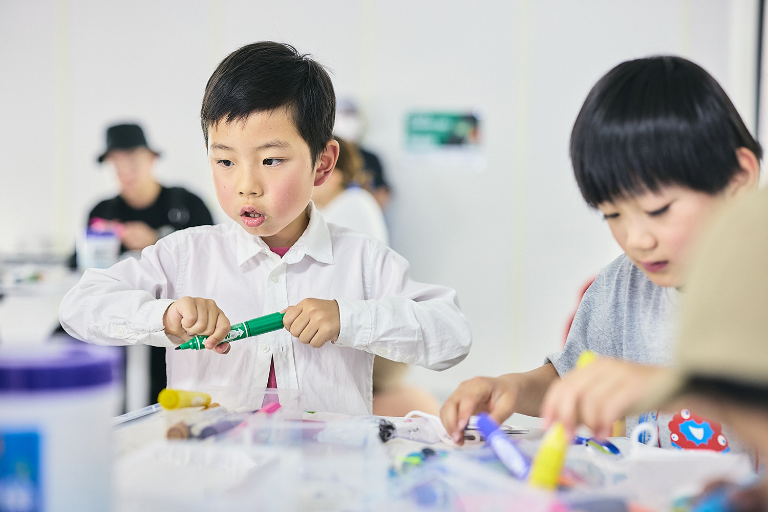 当日は小・中学生とその保護者など多くの方にご参加いただきました。会場内にはダイナミックな釣りの魅力を伝えるビジュアルの展示と、ルアーやロッド(釣竿)などのフィッシングギアで装飾を施し、体験プログラム開始前から興味津々な眼差しの子どもたちの姿が伺えました。そして、釣りを通して自然を学び、狙った魚を惑わし誘うイメージを膨らませる体験「ルアーペイント」に胸を躍らせていました。