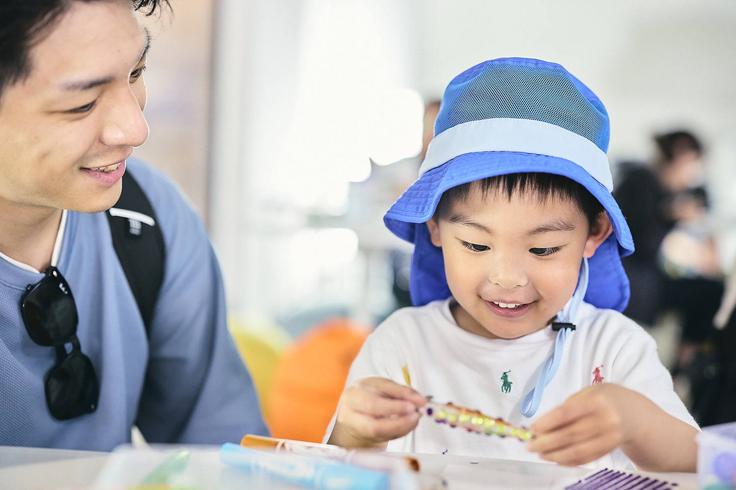 子どもたちだけではなく保護者の方々も一緒となり、カラフルなペンやシールを使って一人ひとりが思う存分に自由なデザインを楽しみました。スパンコールをつけてポップなルアーがあったり、大阪・関西万博公式キャラクター「ミャクミャク」をデザインしたり…、ペイントを楽しむ子どもたちは創造力を膨らませながら「世界でひとつだけのルアーづくり」に夢中になって取り組んでいました。