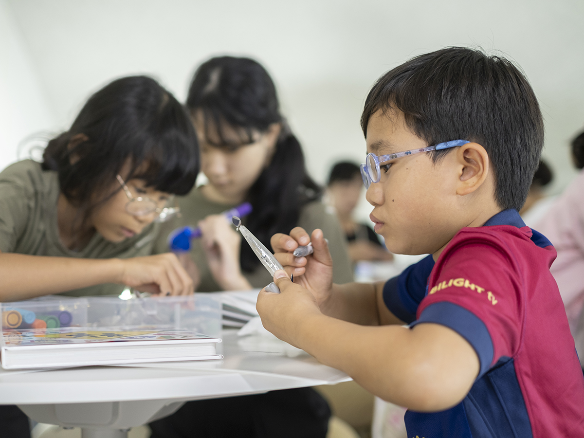 講師の赤羽氏から「自然界には存在しないような鮮やかなカラーや魚の形にエビの模様を描くといったユニークな発想のルアー」も紹介され、子ども達は興味津々。前半の講義で学んだことを思い出しながら、魚や昆虫、恐竜、鉱物、乗り物などのさまざまな図鑑を手に取り、釣りたい魚を思い浮かべながら、透明なルアーに自由な発想で色を重ねていきました。カラフルなペンやシール、スパンコールを使ってポップに仕上げたり、大阪・関西万博公式キャラクター「ミャクミャク」を描いたりと、一人ひとりが想像力を膨らませながら「世界にひとつだけのルアーづくり」を楽しみました