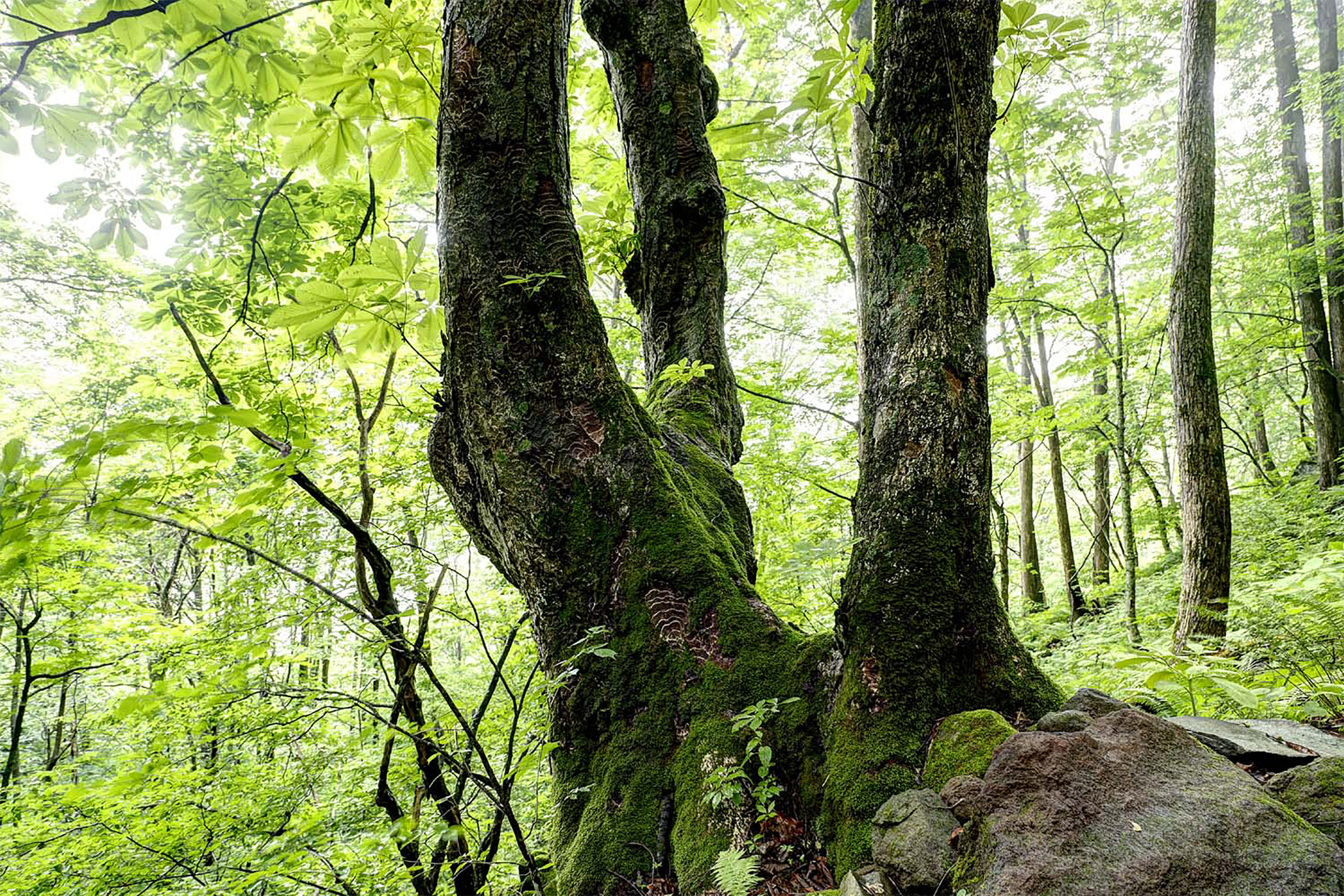 「スギやカラマツなどの針葉樹がダメだとは思っていませんが、間伐や除伐、枝打ちなど、針葉樹の山林の維持にはかなり手間がかかるのです。その点、広葉樹は針葉樹ほど手間がかからずそのまま育ってくれます。しかも根が広がる木が多いので、災害対策にもなります。私たちの広葉樹の森づくりは、まず伐採の際に、30メートルほどの区画に1本、親となる広葉樹を残します。その木から種が落ち、木が育ちます。そうすることで、その土地の植生を崩さず、生態系を守った自然な森が育っていくのです。仁礼会の構成員には若い世代の人たちもいるのですが、手間のかかる山の手入れにはやはり消極的です。その点、広葉樹の手入れは手間も少なく、森の自然な成長を楽しむこともできます。大事なことは若い世代が山に入ることです。山に入れば癒されるし、自然の雄大さに感動する。その体験が、自分たちがこの山を守っていかなくてはいけないという意識の元になるのです」