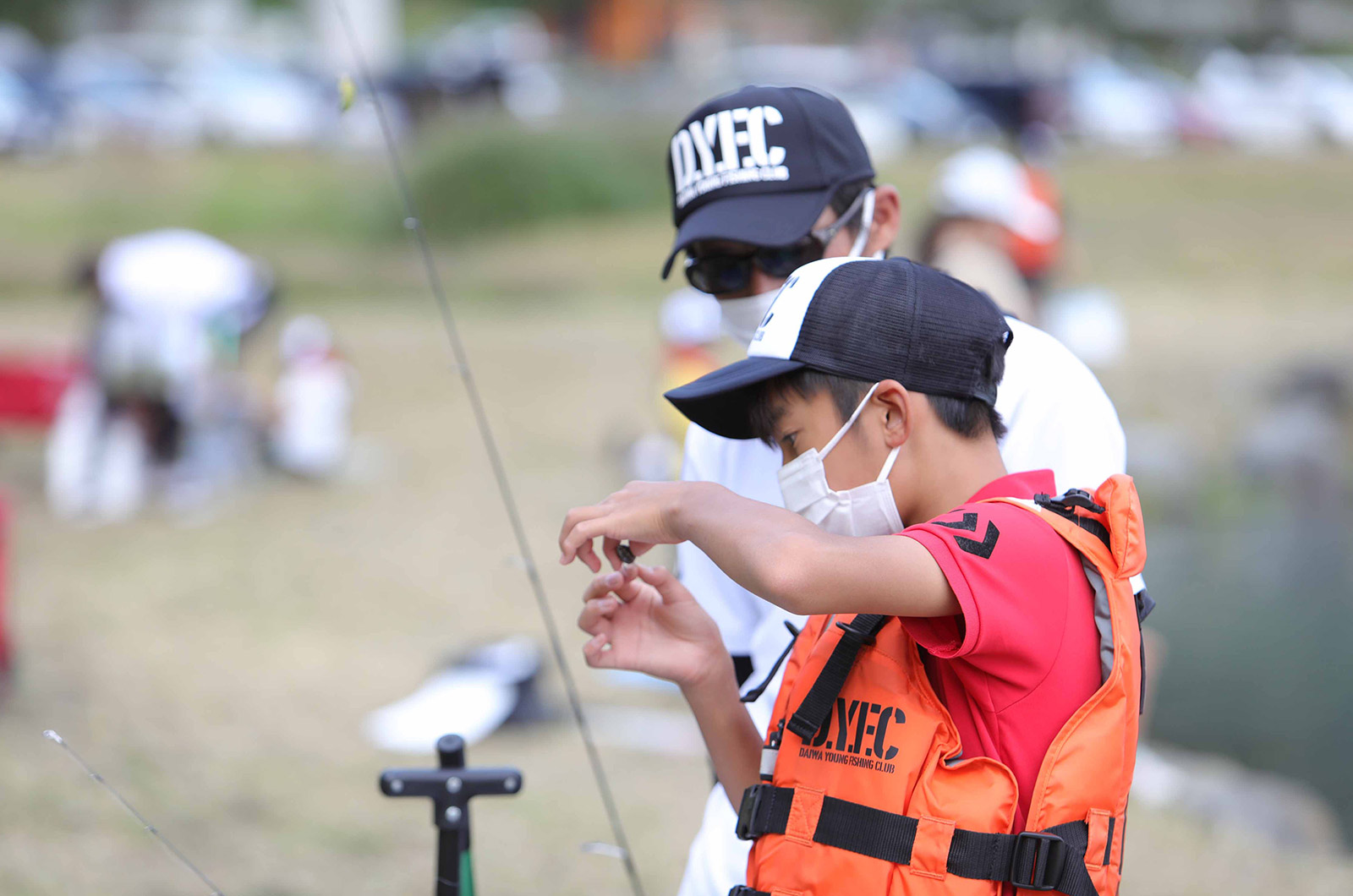また、より安全に子どもたちに釣りを楽しんでもらうため、すべてのフィッシングスクールでフローティングベストを着用。子どもたちにとって必要とされるフローティングベストを年齢や体格に応じて着用できるD.Y.F.Cオリジナルフローティングベストをゼロベースから整え、それがアイコンとなっています。