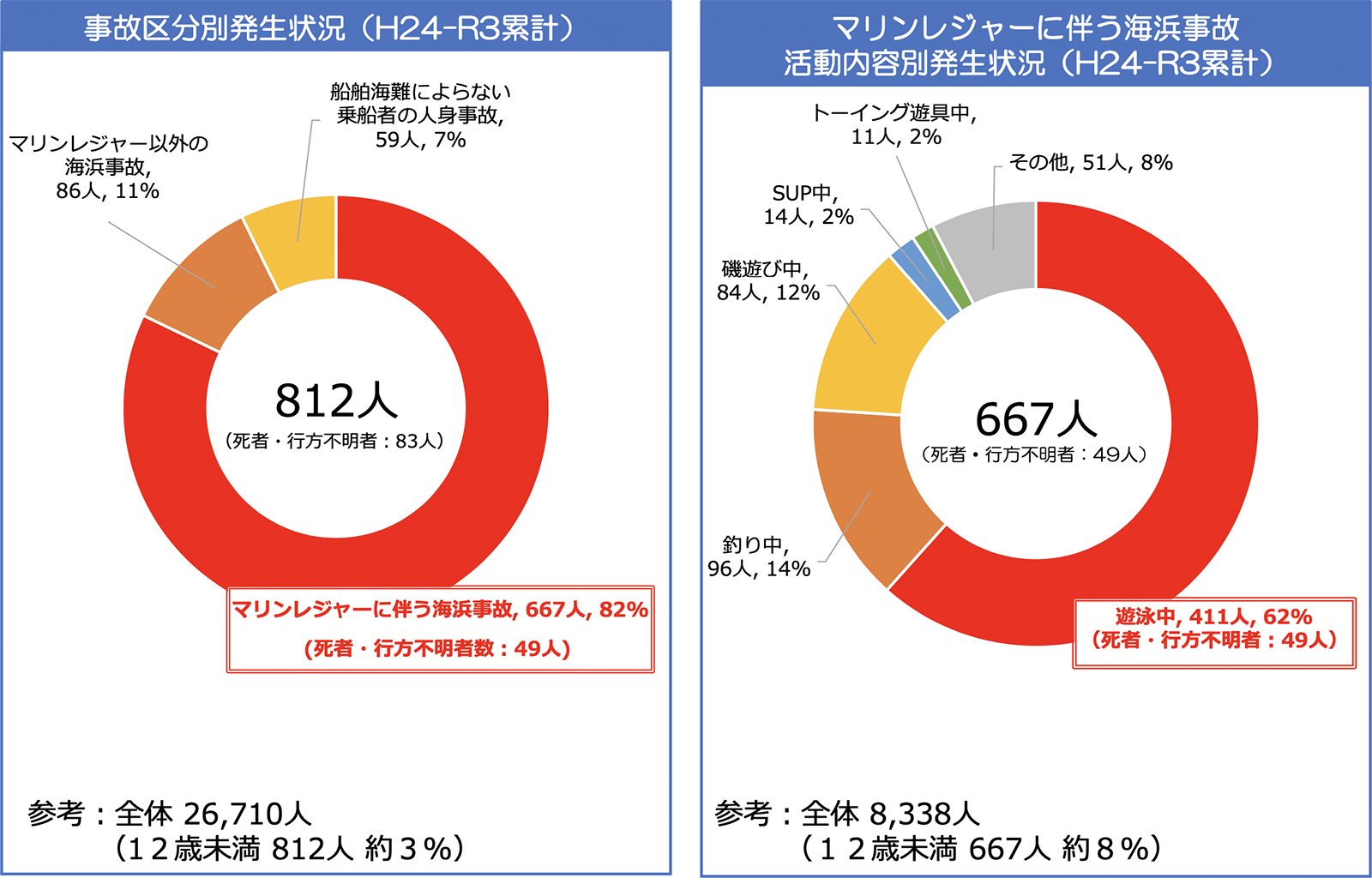 2022年(令和4年)6月に発表された海上保安庁のデータを見ますと、2012年(平成24年)から2021年(令和3年)まで10年間、12歳未満の「マリンレジャーに伴う海浜事故」は667人。そのうち遊泳中の事故は411人でした。