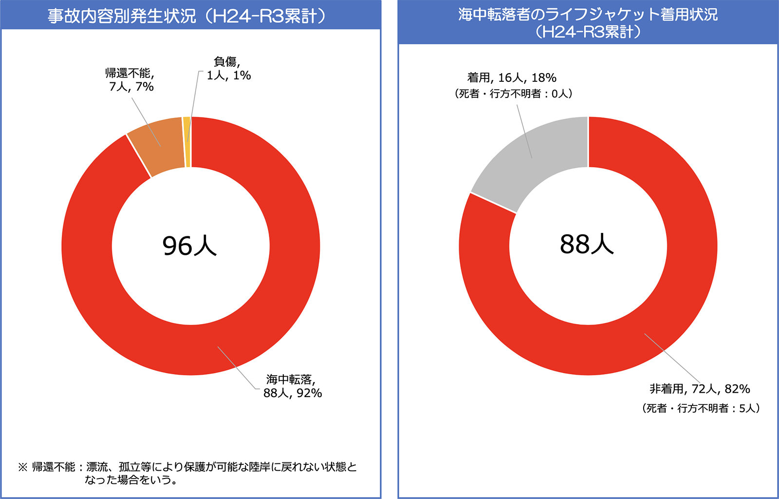 12歳未満の子どもの事故(平成24年~令和3年)は96人中88人が海中転落です。そのうち72人がライフジャケットを着用していませんでした。子どもたちが堤防や岩場で足を滑らせてしまったり、うっかり海に落ちてしまったりすることはゼロではありません。
