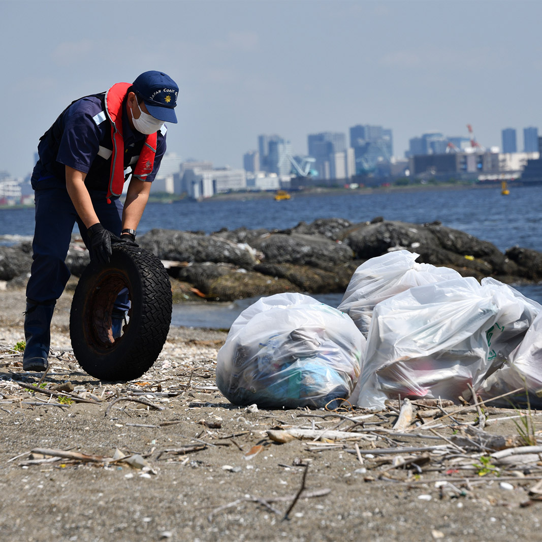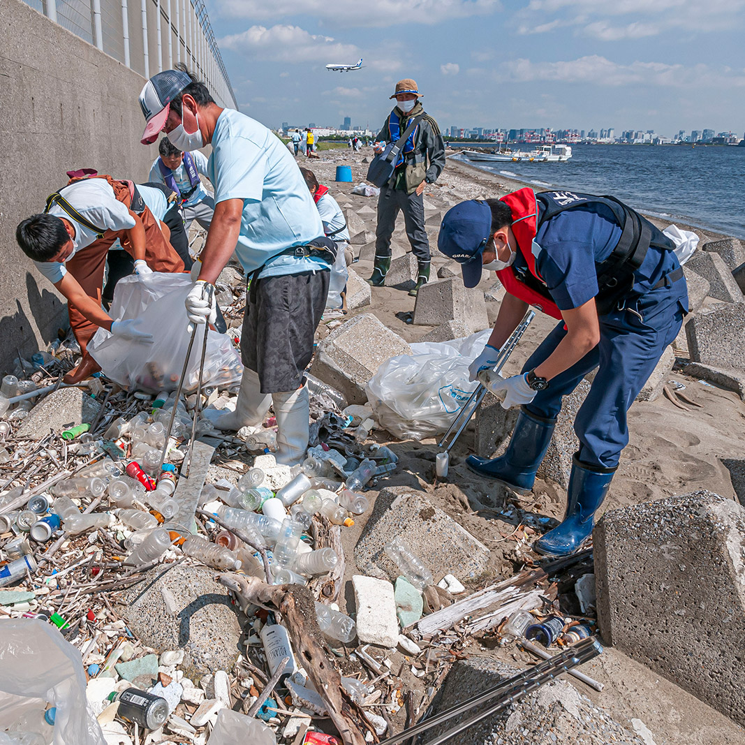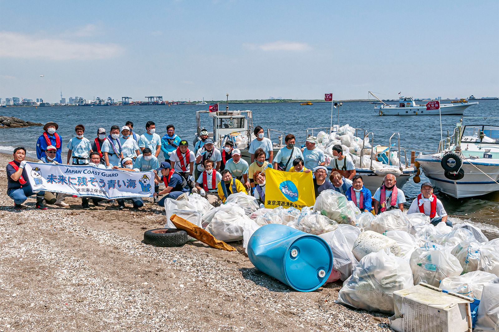 同組合では、昨年(2022年)5月に組合員総出で羽田空港東側の海岸一帯(羽田沖浅場)を清掃。海上保安庁東京海上保安部からも3名が応援に駆け付け、ペットボトルなどの漂着ゴミ150袋余りを回収した。