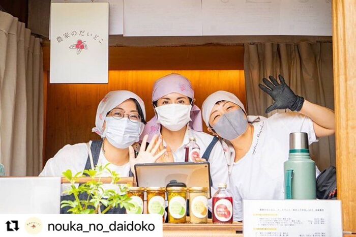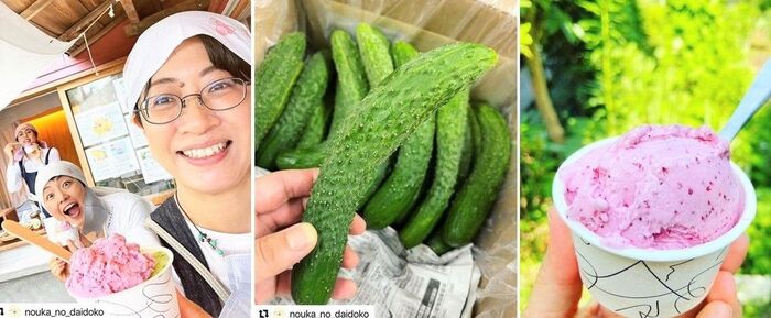 - さ 「農家のだいどこ」のメンバーは、私と、料理研究家のヤミーさん、中元千鶴さんの3人なんだけど、この農家さんに惚れ込んでしまって、よく遊びに行っていたんです。 そんな中で、出荷しないお野菜があることを知りました。 こんなに美味しいお野菜なのに、捨てるなんてもったいなさすぎ!虫食いがあっても加工したら食べられるよね!!ということで、これらのお野菜を買って、加工して販売するっていうのを始めたんです。 それが22年8月にスタートした「農家のだいどこ」です。 ヤマモモやきゅうりはジェラートにして売ったんですが、自画自賛なんだけど、すっごく美味しくて、好評でしたよ。楽しかったな~。