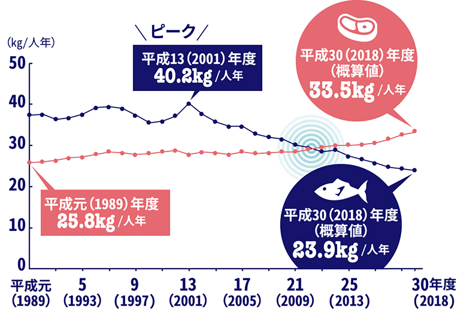 ここで水産庁による「一人1年当たりの魚介類消費量」のグラフを見てみたい。日本では平成13年(2002年)を境に魚介類の消費量が減り始め、平成23年(2011年)以降は肉類の消費量が魚介類の消費量を上回るようになった。しかし海外では魚介類の消費が伸びている国も多く、和食人気とともに魚食への注目が高まっている。魚は旬を感じることができる食材であり、健康効果も期待できる。魚にはDHA(ドコサヘキサエン酸)が含まれており、記憶や学習といった脳の機能を高めるともいわれている。海に囲まれた日本において魚食の機会が減っていくことはもったいないことであり、魚食の良さを改めて見直したいものだ。また頭から尻尾まで丸ごとまな板の上に乗る食材である魚は大切な食育の教材であり、ぜひとも家庭で子どもと一緒に調理してほしい。