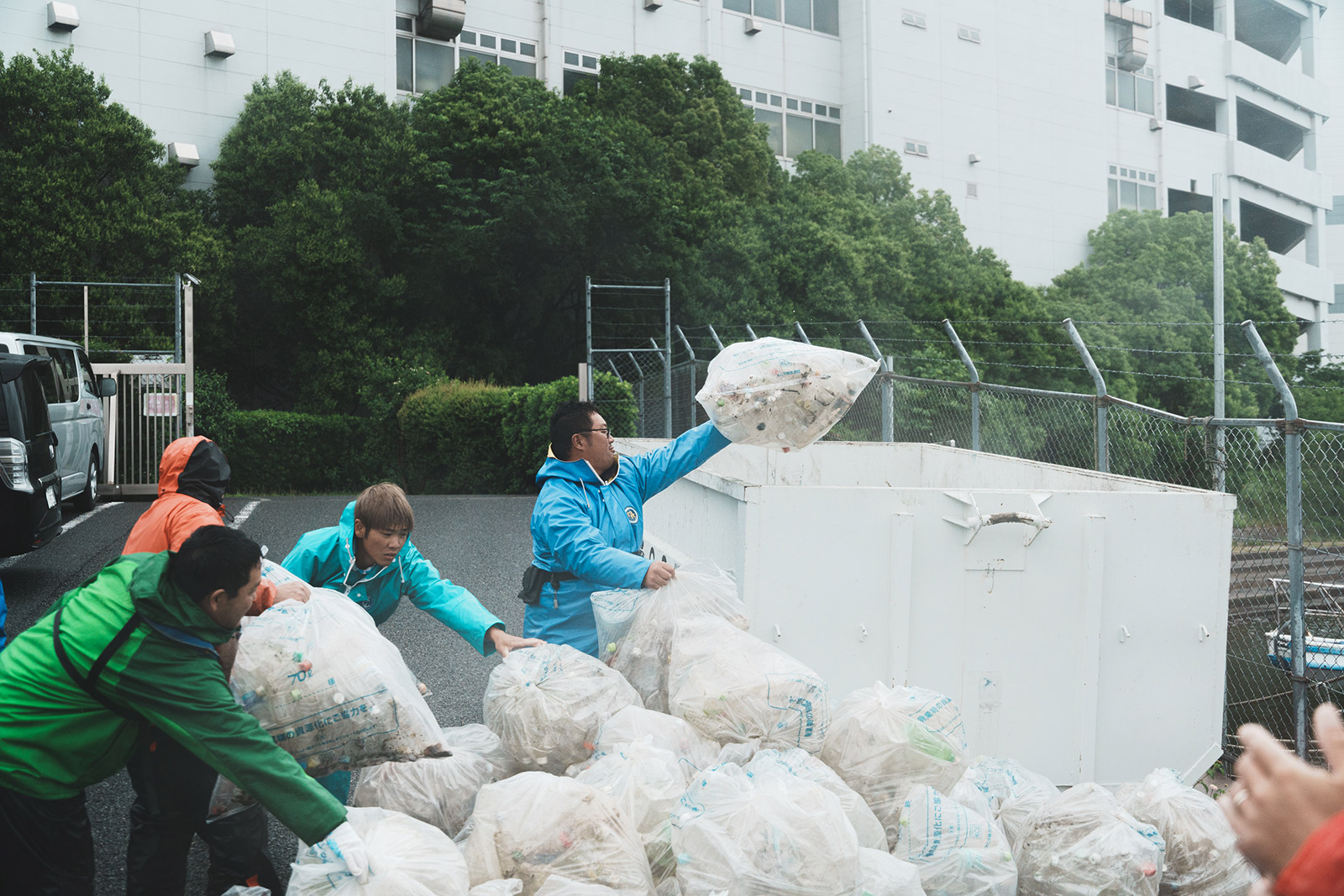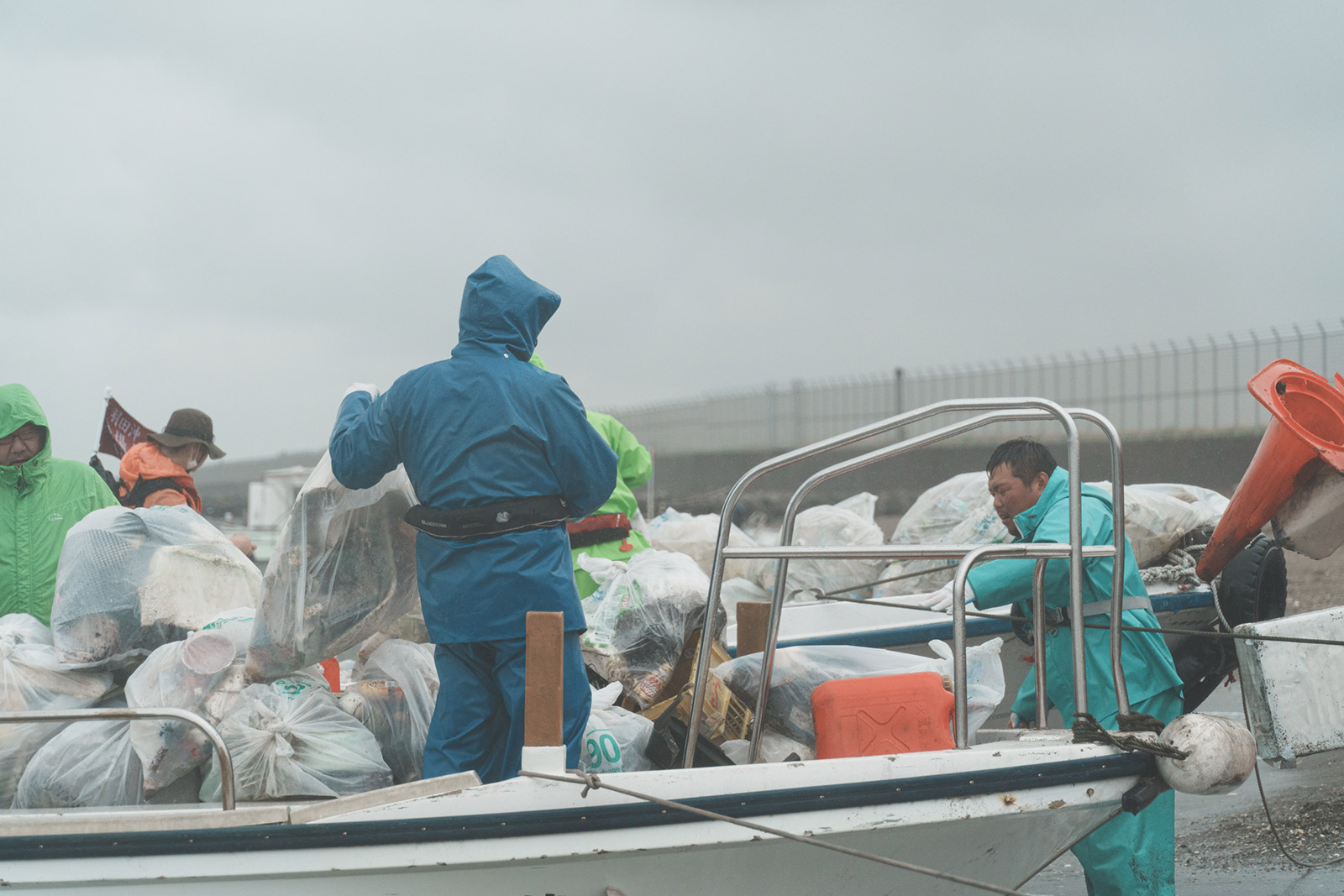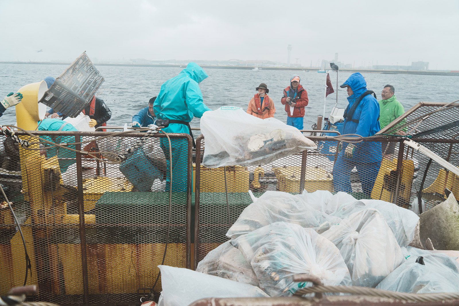 当日は、あいにく本降りの雨となりましたが、午前8時に大田区平和島「まる八」桟橋を出船し、午前8時半に羽田沖浅場に上陸。組合員・スタッフ総勢40名で清掃活動を行いました。昨年に比べると車のタイヤなどの大きなゴミが多くありました。雨脚が強くなったため、午前10時半には帰港となりましたが、90ℓゴミ袋で85袋を回収し、東京都の清掃船に運び入れて清掃活動は終了しました。