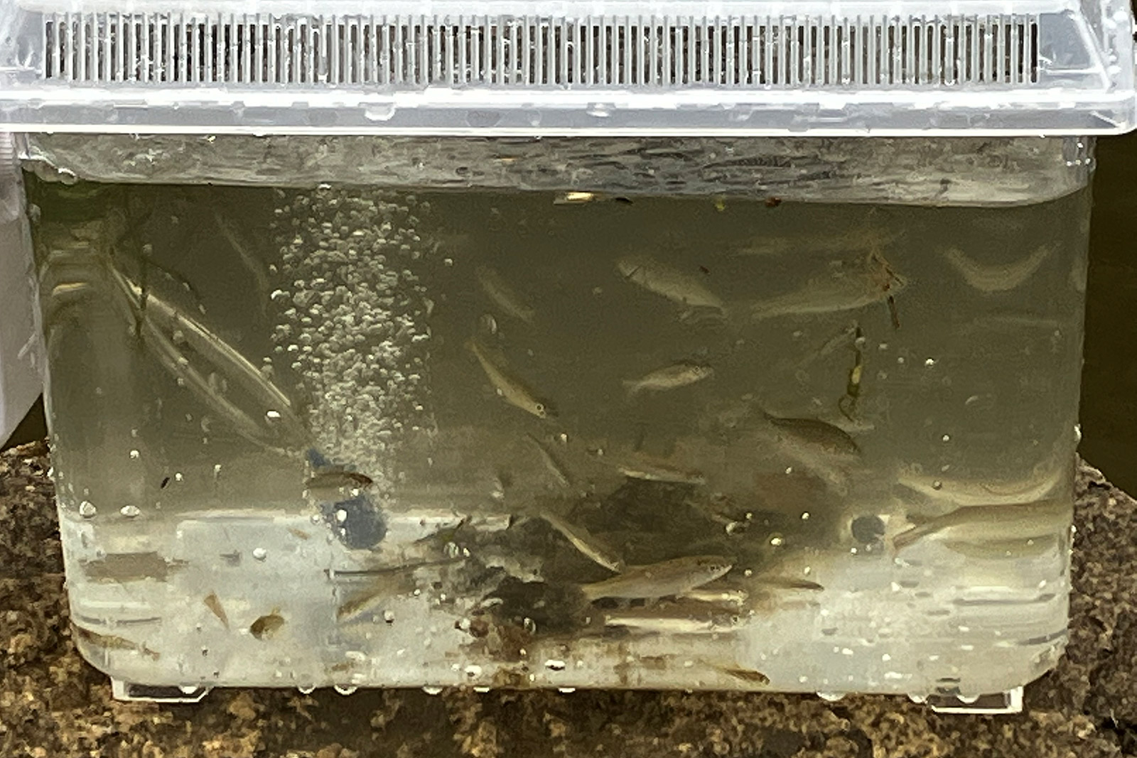 - そんなある日、川の中に落ちていたヘルメットの中に魚が4尾いるのを見つけて「こんなに汚い川にも魚がいるんだ!」って、息子と一緒にとても驚いたなぁ。