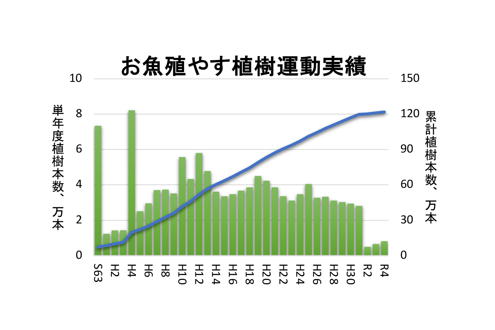 「植樹はもともと、漁協の婦人部連絡協議会(現在は北海道漁協女性部連絡協議会)の30周年記念事業として行われたものでした。80年代当時の漁獲は好調でしたが、河川改修や農地の拡大、土地利用の変化など開発行為も盛んだった時期で、漁協としては魚を殖やすために始めた取り組みだったのです。当時、漁業における環境問題などを担当していた北海道指導漁業協同組合連合会(2004年に北海道漁業協同組合連合会と合併)参事の柳沼武彦さんが中心となり、婦人部とともに魚を殖やすためには森への植樹が必要だという考え方を北海道各地に広めていきました。柳沼さんは森と海の関係に着目し、植樹によって森を豊かにすることで漁獲量の改善につなげていきたいと考えていたようです。その想いに応え35年以上に渡って続けてきた植樹運動は農林水産大臣賞を受賞するなど、これまでたくさんの評価をいただきました。2016年には環境に関する国際会議であるCOP13(気候変動枠組条約第13回締結国会議)のパンフレットにも採用されました。活動が評価されることは大変嬉しいことですが、植樹によって漁獲量が増加したという具体的な成果を数字で表すことはなかなか難しいものです。海が豊かになり漁獲量が増加する要因は、植樹以外にもさまざまにあるからです。しかし、70年間継続してきた『えりも岬』の緑化活動では大きな成果が出ており、植樹の意義として私たちも参考にしています」