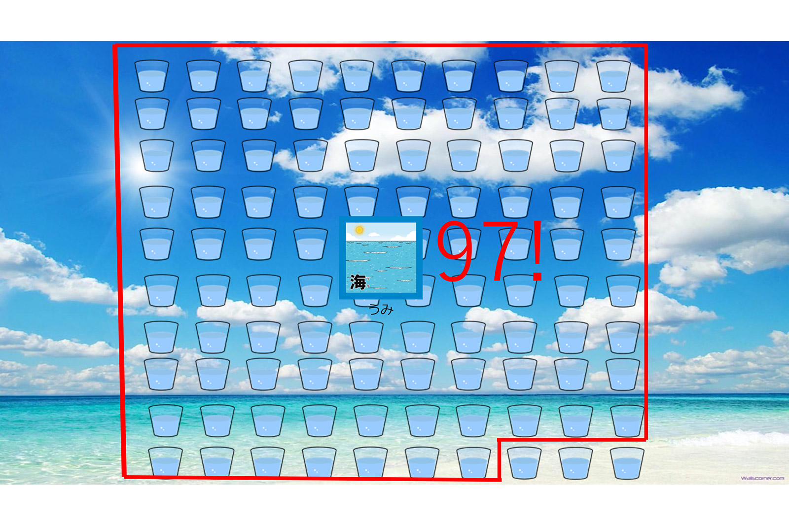 「東京湾と森の関係について話すにあたって、まず水の基礎知識として地球のどこに水はあるのか・・・と子どもたちに投げかけました。地球全体の水の量をコップ100杯だと仮定すると97杯が海の水で、残り約3杯が川や湖など陸上で得られる水ということになります。しかし、その3杯のうち2杯半の水は極地等で凍っています。残りのコップ半分も地底深くにあり取り出すことが困難です。つまり私たちが暮らしの中で使える水の量は、地球全体の水の量をコップ100杯とした場合、スポイトから垂れる1滴ほどの水しかないということになります。