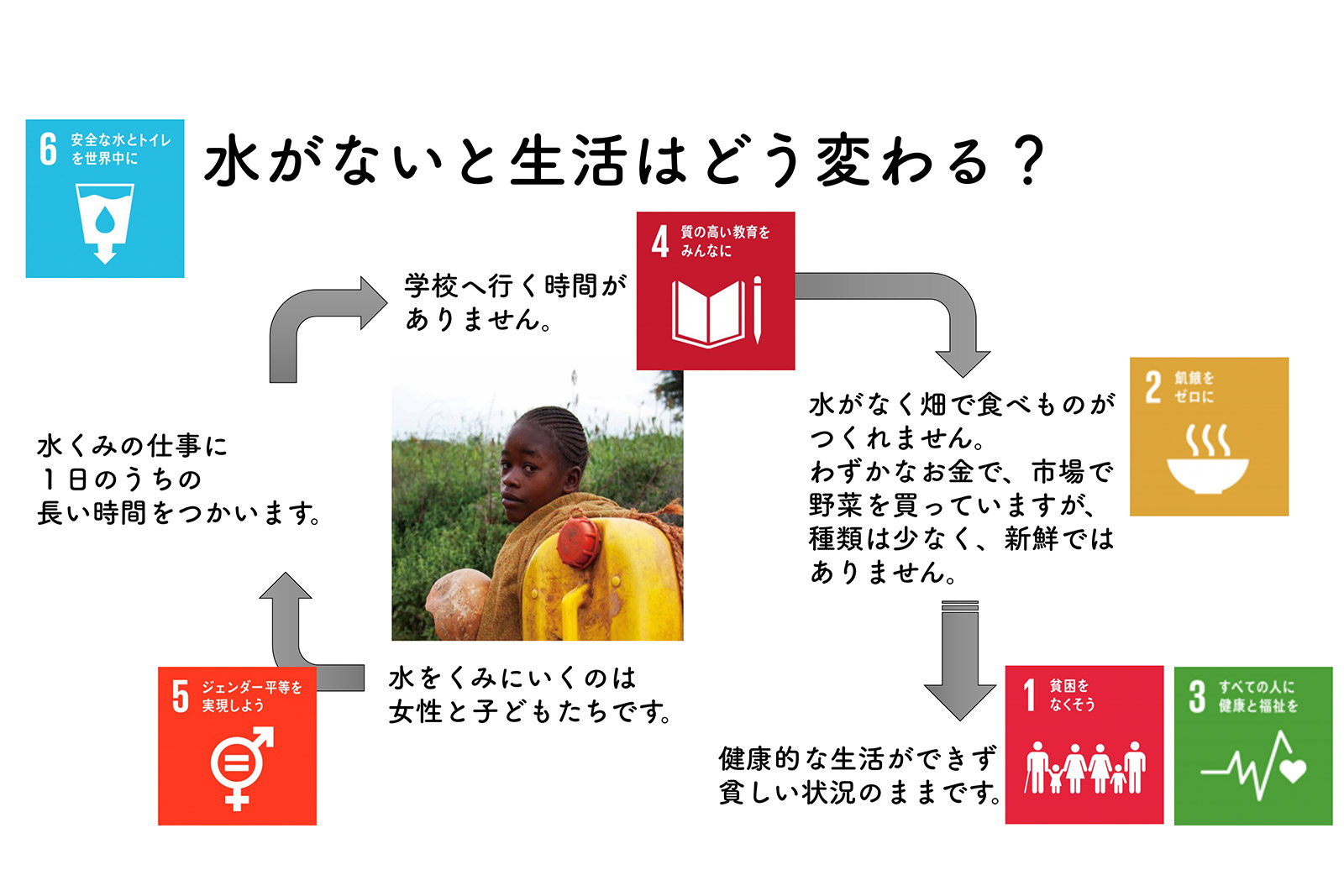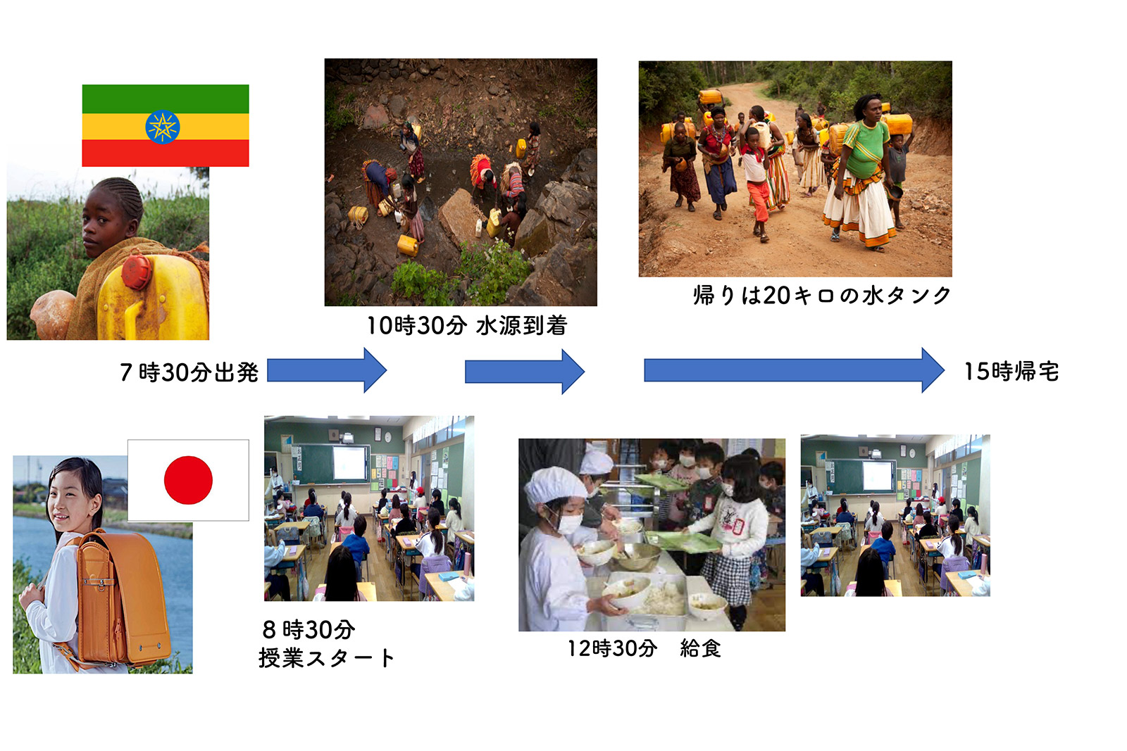 「私が訪ねたエチオピアの集落の子どもと日本の子どもの日常、平日の生活を比べてみました。朝、日本の子どもは学校に向かいますが、エチオピアの子どもは水汲みに向かい3時間ほど歩いて水源に到着し水を汲みます。日本では給食の時間です。エチオピアの子どもはポリ容器に入れた10キロほどの水を抱えて帰路へと向かい、夕方に家に着きます。同じ時間に日本の子どもたちは家に帰りますが、残念なことにエチオピアの子どもは学校で勉強する機会もなく水汲みが最優先なのです」