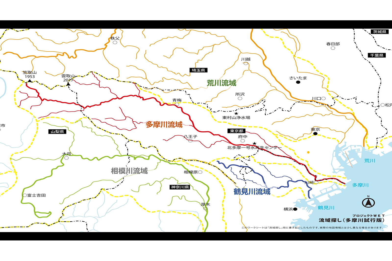 「さて、水がどこで循環するかを考えてみましょう。それが下の図で示した『流域』です。東京湾とその水を守る森をテーマとすれば、東京湾に注ぐ多摩川を例に、水がどのように河川に集まってくるのか・・・白地図上で確認してもらいます。水の流れに着目し多摩川の本流だけでなく支流や沢などもなぞって色を付けてみると、山に降った雨が徐々に集まり多摩川に流れ込み東京湾へと流れていることがよくわかります。都市部に暮らしていると忘れがちですが、東京湾の水は多摩川上流域の森から流れてきているんですね。森が元気でないと海に注ぐ水にも影響が出てしまいます。大量に木を切れば森は保水力を失い災害が発生しやすくなります、また水の少ない固い土となれば微生物なも棲みにくくなり、まさに生物多様性も失われます。海について考えるときは、海に注ぐ川の上流域の森についても考えてみて欲しいのです。森から鉄やリンなどの栄養分が雨水や地下水に溶け、川に流れ込み、流域の生き物に栄養を与え、海に注ぐのです。つまり流域は川・海を含めた広い範囲のことで、流域圏はそこに暮らす人間、生息・生育する生物にとって共同体といえます。利水、治水、水環境に関連するさまざまな問題は流域圏にあります。水枯れ、豪雨災害、地下水汚染なども、問題が発生した点だけに注目するのではなく、上流域から中流域、下流域へ、また、地表水から地下水へと、流域圏全体の水の流れを面的に考える必要があるでしょう。自分がどの流域に属しているかを知っておくことは、地球環境を考える上で、とても大切なことなのです」