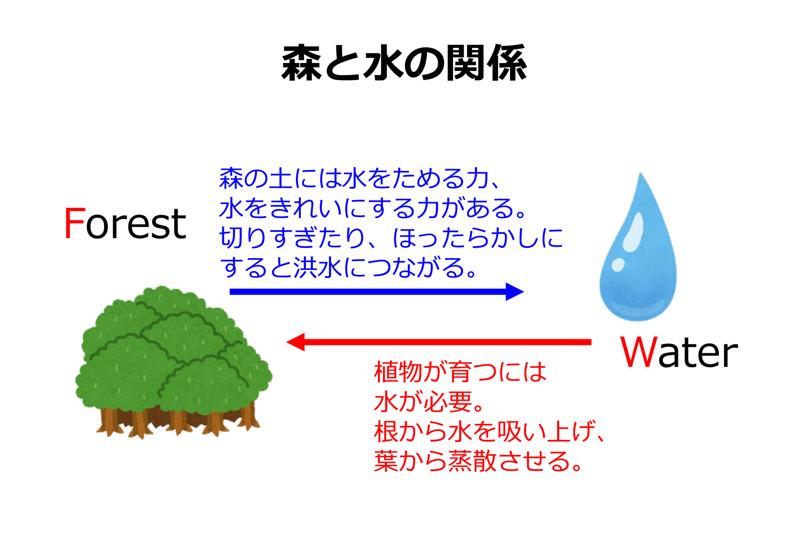 近年、大きな問題となっている気候変動も水と大きく関わっている。水の多い地域では気温が上がると、空気中の水蒸気量が増え、湿度が高まり強い雨が降り、豪雨災害を引き起こす。水の少ない地域では気温が上がることで土に含まれる水分が蒸発しやすくなり乾燥が進み、水不足や干ばつが深刻化する。
