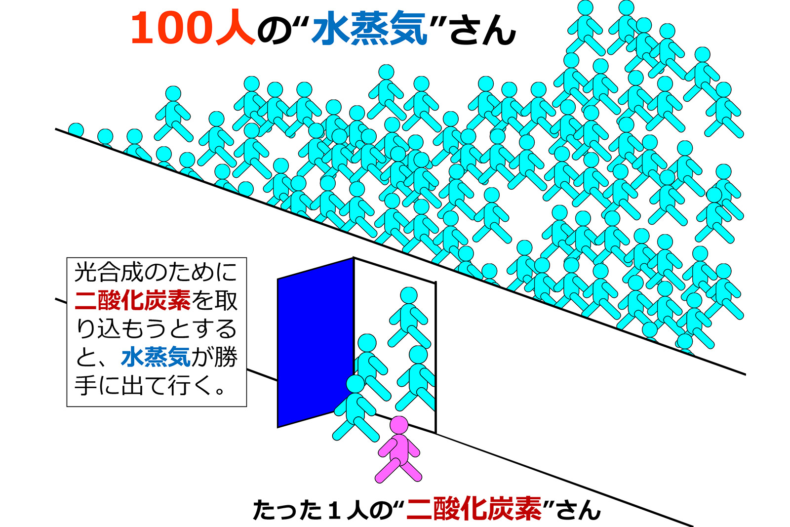 「まず森林の樹木を思い描いてください。光合成のために必要な二酸化炭素は、葉の裏にある気孔を開けて大気中から取り込まれます。気孔を開けると、そこから水分が外に出ていきます。これを『蒸散』といいます。『蒸散』と同時に二酸化炭素を取り込むわけですが、その割合は二酸化炭素を1とすれば、蒸散される水分量はその数100倍にもなります」