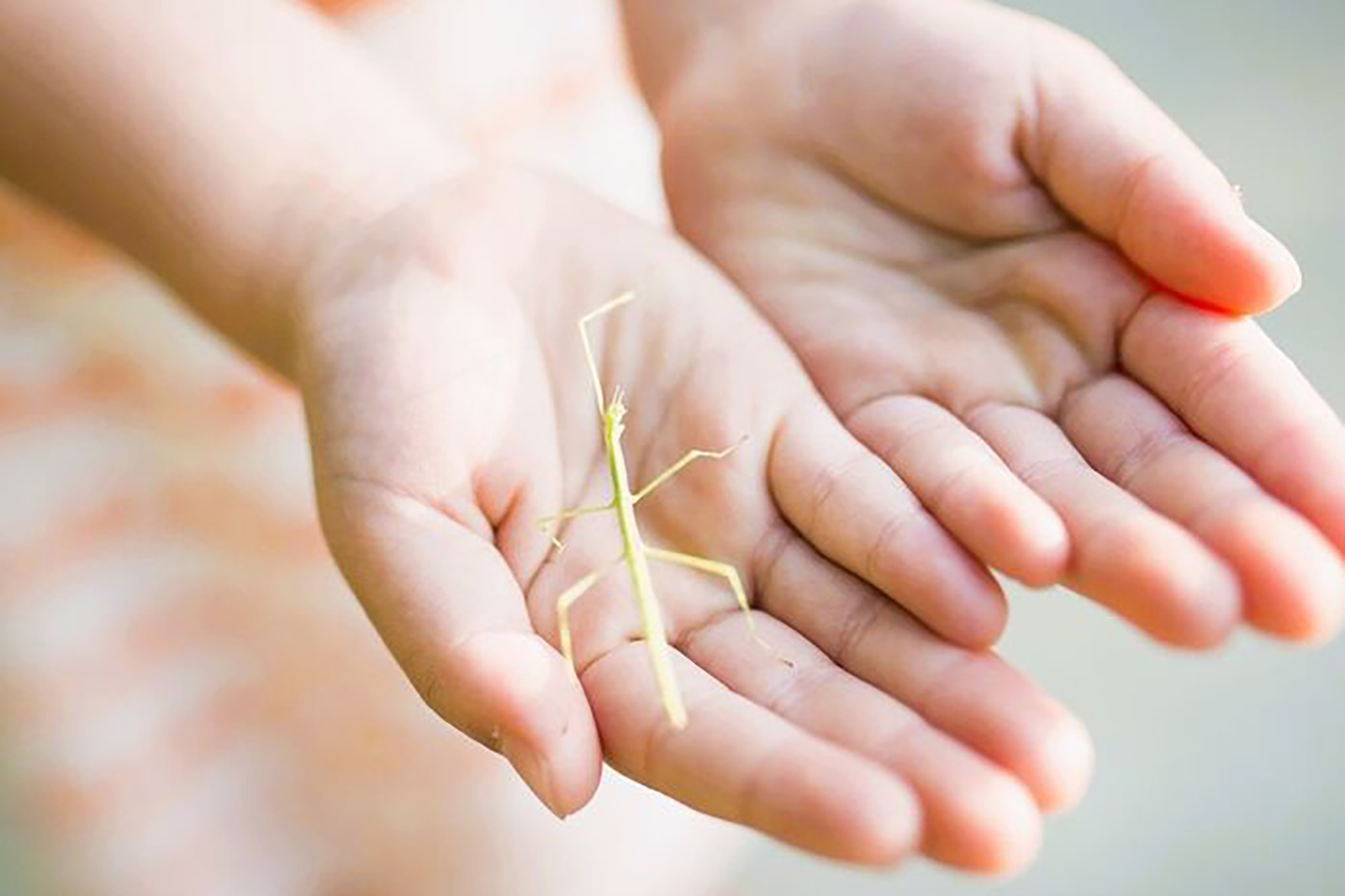 ナナフシを拾ってきた子には、「この中でいちばんきれいなやつを標本にしよう」と声をかけました。きれいな空き箱にわたをつめて大切にしまったら、すてきな宝物になるよね。こうしたうれしい経験から、子どもの興味は広がっていきます。