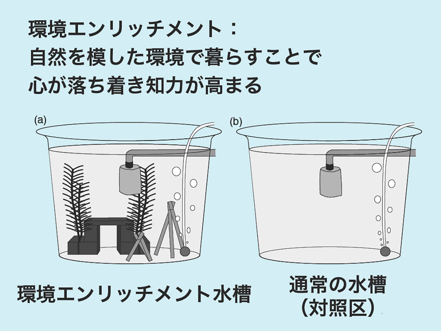 構造物を置いた水槽と空の水槽と異なる環境でイシダイを泳がせると、構造物のある水槽で泳いだイシダイは脳が刺激され、賢くなることが実証されている。