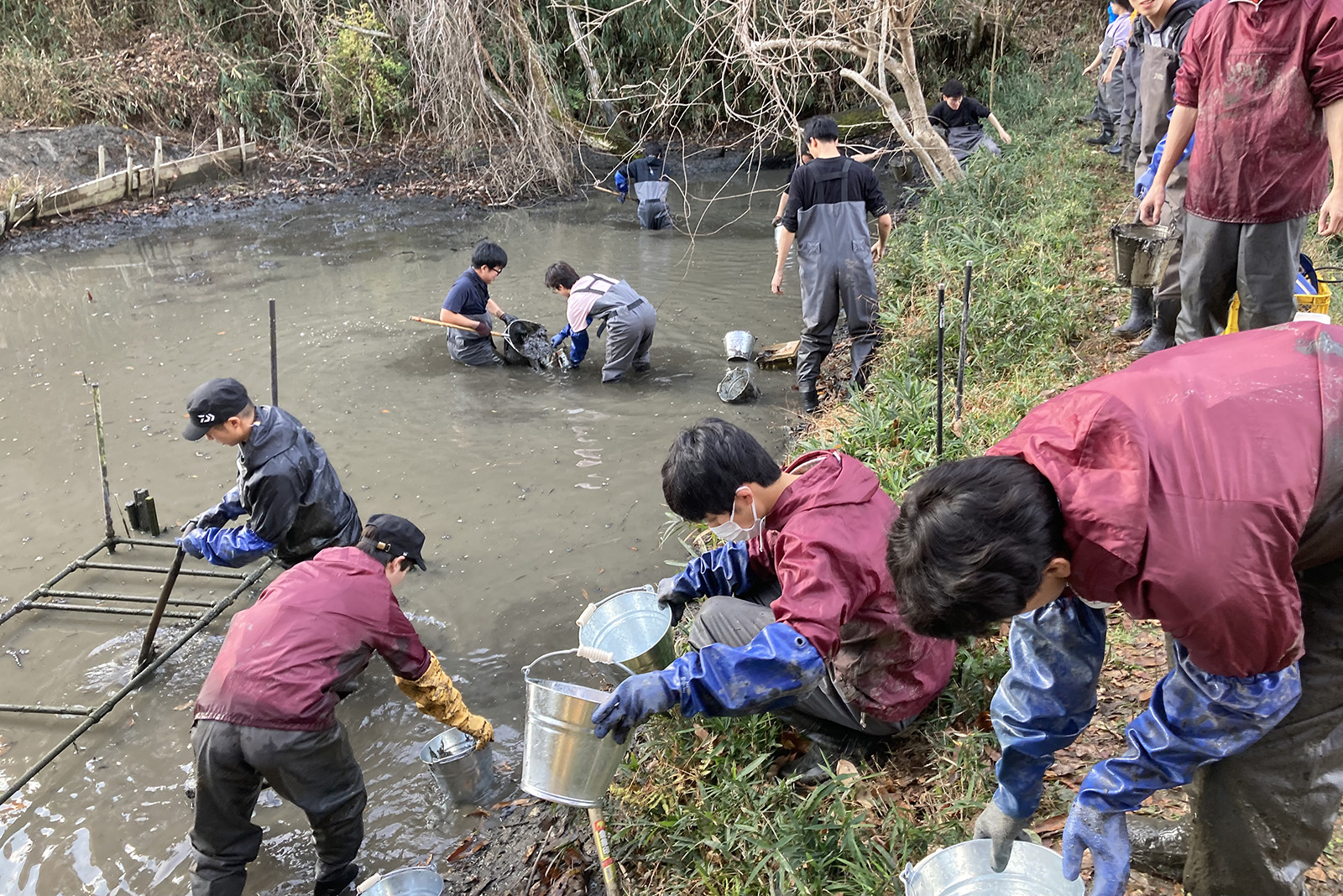「かいぼり」とは日本の伝統的なため池管理方法で、農閑期にため池の水を抜き、底に堆積した泥を掻き出し、底土を天日にさらすことだ。ため池は放置すると水が長期間滞留し、富栄養化が進む。そのため酸素不足となり、水中の様々な生物が命を失ってしまうのだ。