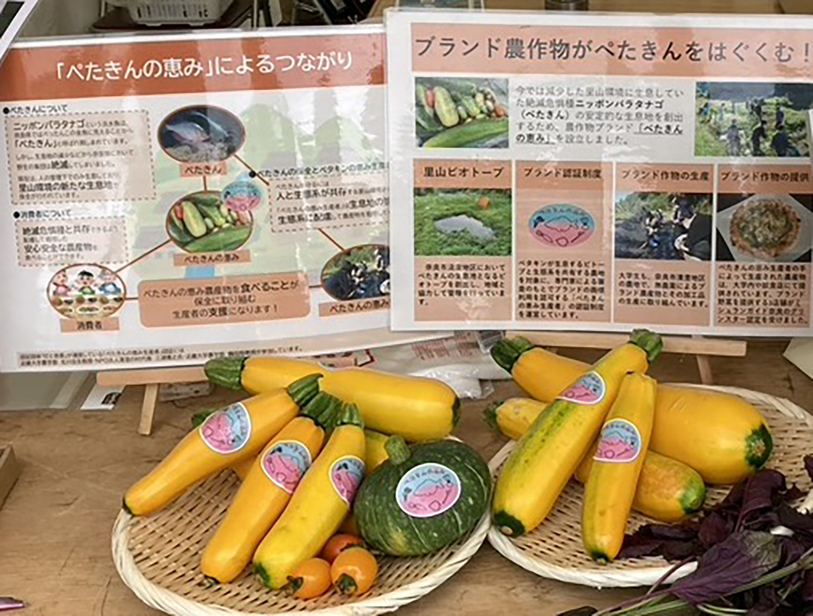 キャンパス内の里山ビオトープとキャンパスから離れた場所にも里山ビオトープを作り、ニッポンバラタナゴとその生態系を保全する里山周辺の農地で栽培された農産物を、ブランド作物として認証する仕組みを作ったのだ。ニッポンバラタナゴが自然繁殖している健全な生態系で育った農産物を選ぶことで、私たち消費者も間接的に生物多様性の保全に貢献できるという仕組みだ。