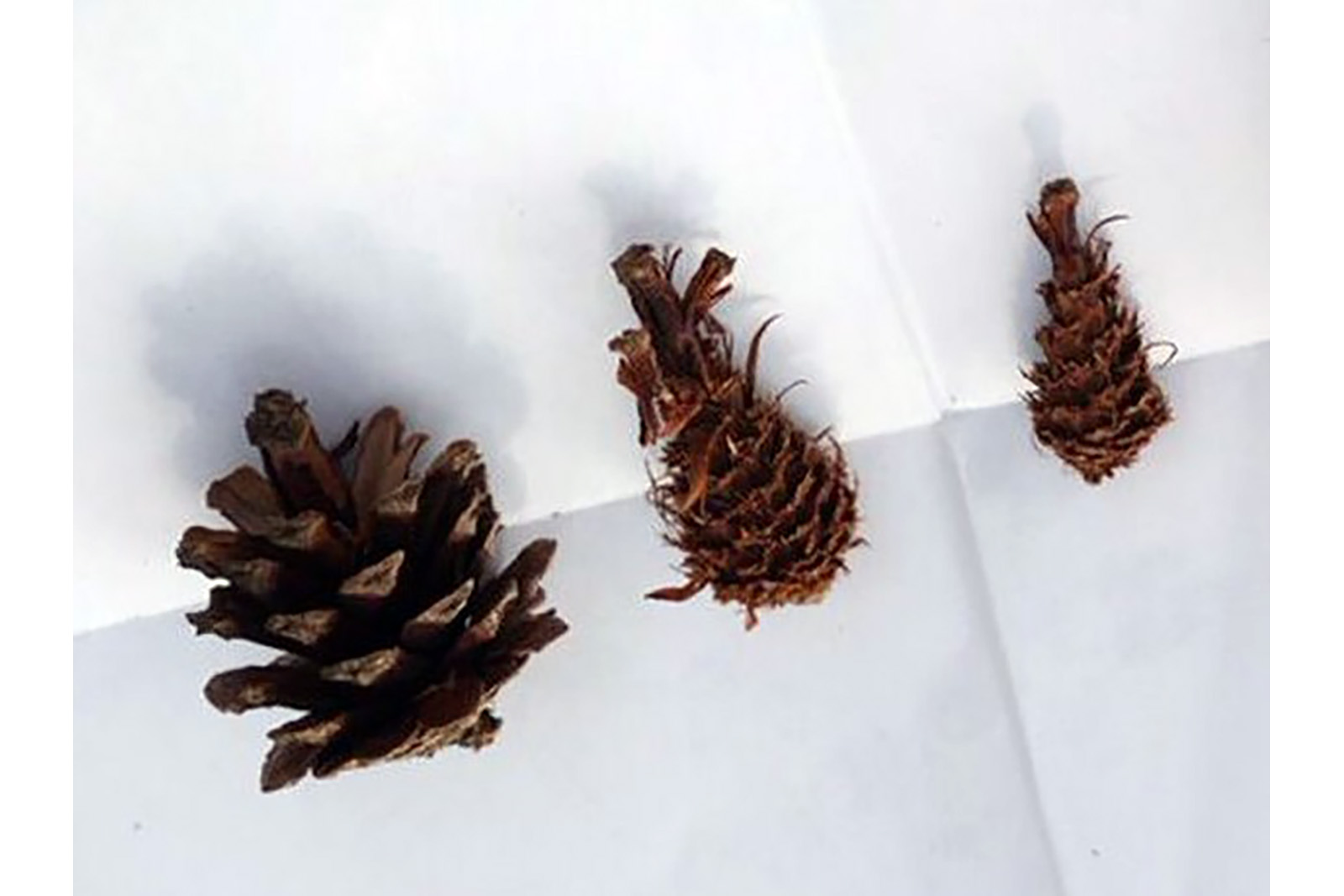 リスの食い跡もおもしろいですよ。日本のリスは松の実が大好き。松の実は、松ぼっくりのうろこ状の付け根についているんだけど、リスは実だけを器用にかじって残りをポイッと捨てるんです。その捨てられた芯が、なんとエビフライにそっくり!
