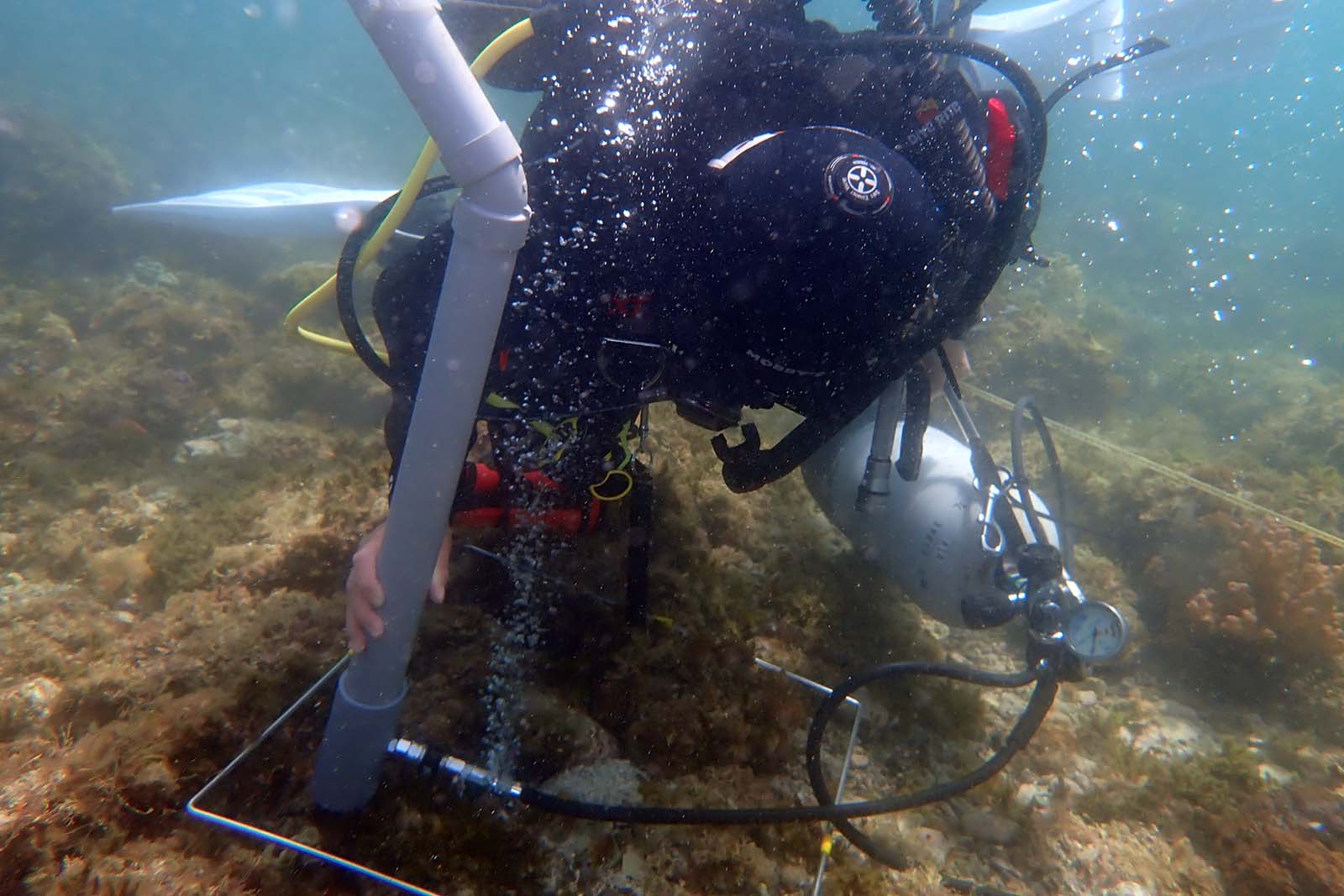 海洋プラスチック調査。専用機で海底に沈んだプラスチックを吸引。ブルーカーボンとは直接的に関係ないものの海の状況を把握するために海洋プラスチックも調査対象とした。