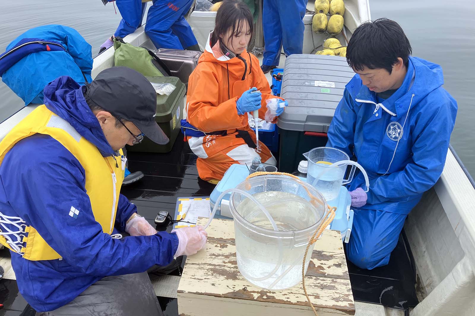これだけでも十分な調査項目数に思えるが、潜水調査と並行して船上での調査も行なっている。藻場の影響が沿岸から沖合にかけてどの程度まで波及するのかを測定するのだ。藻場が生えている場所から沖に向けて船を動かしポイントごとに海水を採水したり、専用センサーを海中に沈めたり、測定方法はさまざまだ。