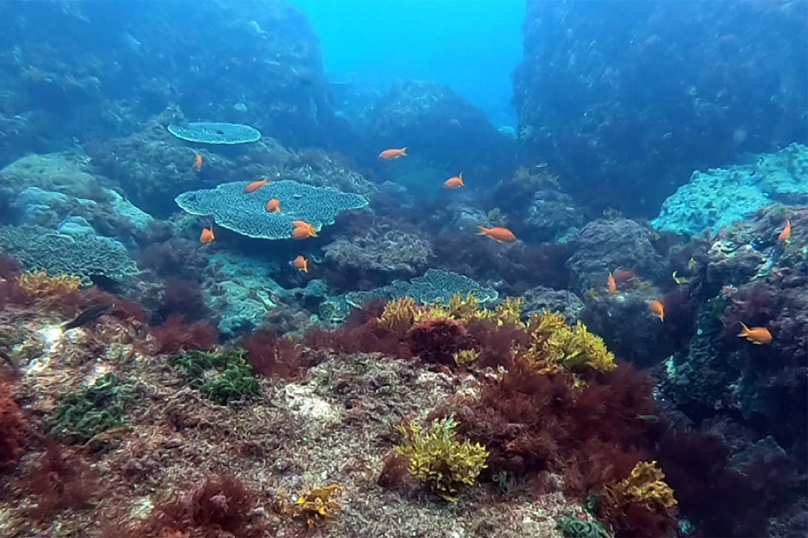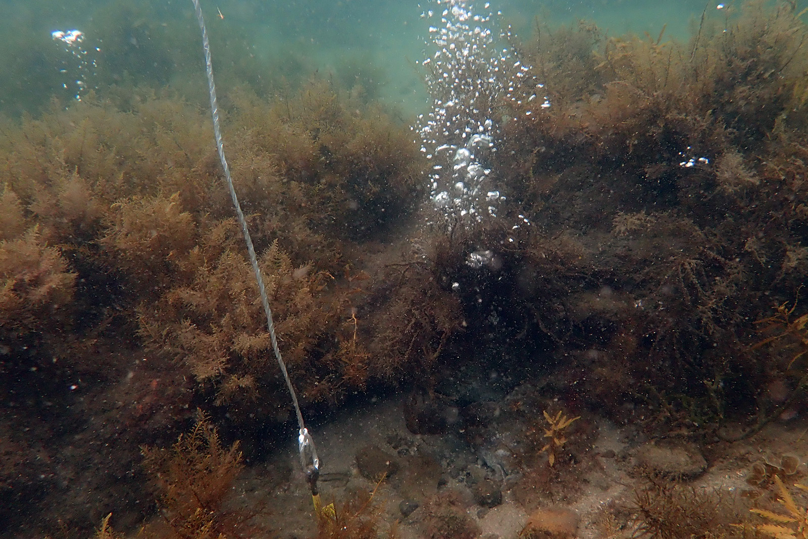 「姫島のCO2シープは広範囲な場所ではないので、CO2シープ中心地から100メートル離れた場所では噴出した二酸化炭素の影響をほとんど受けません。つまり「現在の海」の姿と言えます。ところがCO2シープに近づくにつれ徐々に景色が変わり、「未来の海」の姿に変わっていきます。100メートル離れた場所からCO2シープに向かって泳ぎ、中心から20〜30メートル離れた場所まで進むと生物相がガラリと変わります。背の高い海藻が巨大なカーテンのように立ちはだかり、その他の種の海藻は少なくなります」