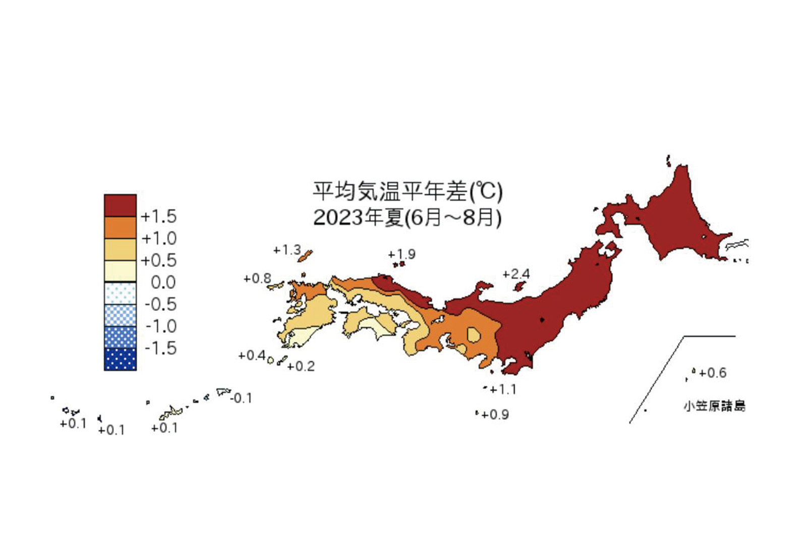 2023年の平均気温は、気象庁によれば平年値との差が北日本で+3.0℃,東日本で+1.7℃,西日本で+0.9℃であった。この気温の平年差は、1946年の統計開始以降で北日本と東日本で一番の値、西日本でも一番とタイの値であった。特に北日本では6月から8月までの各月で歴代トップの値となる記録的高温で、地域別でも北海道・東北・関東甲信・東海・北陸・中国で歴代トップ、近畿でも歴代トップタイを記録する。しかも北ほど平年との差が大きく,気温の南北差が縮小した結果と言える。
