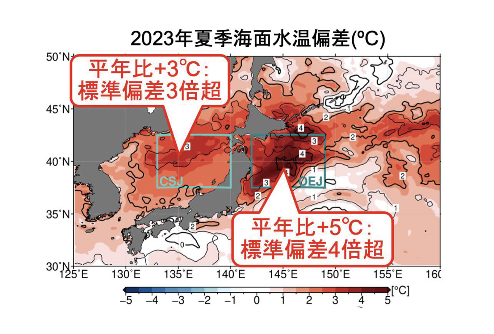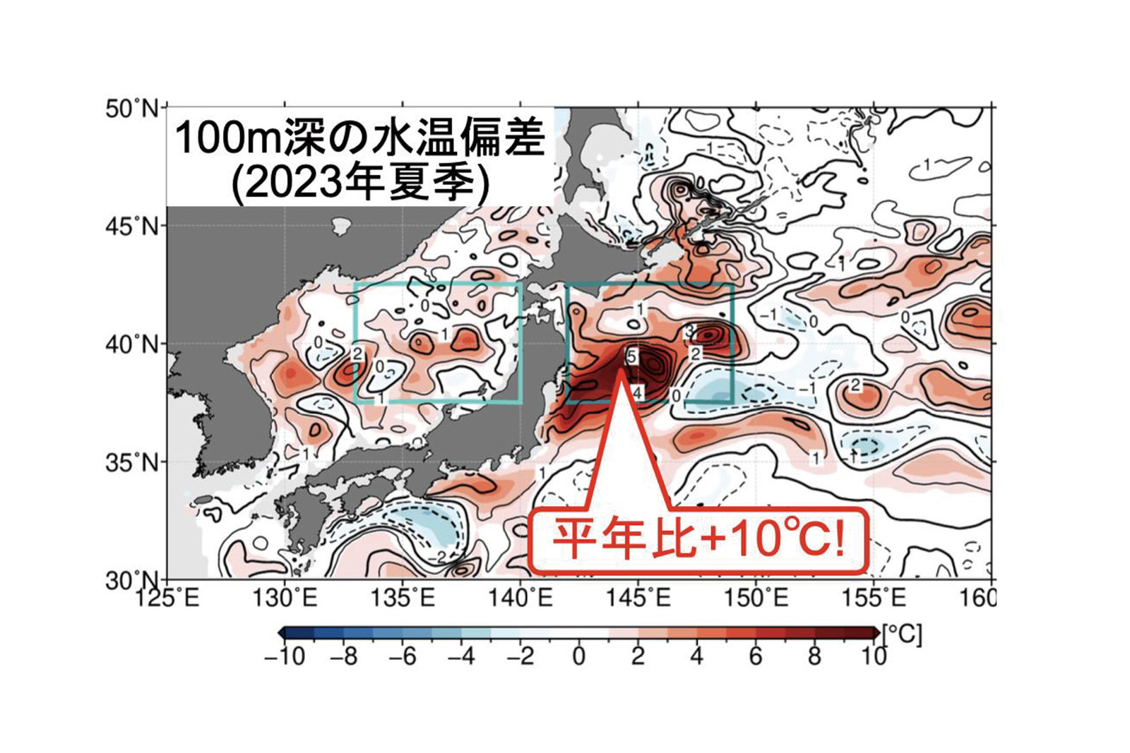 2023年の夏は、北日本東方沖や日本海中部を中心に海面水温が平年より顕著に高い海洋熱波状態になっていたのだ。特に北日本東方沖(三陸沖周辺)では海水温が過去最高で、海面水温が平年比+5ºC、100m深では何と平年比+10ºCにも達した海域もあった。海面表層ならまだしも、海面から100mも深いところでこんなにも水温が上がっていたとは本当に驚きだ。
