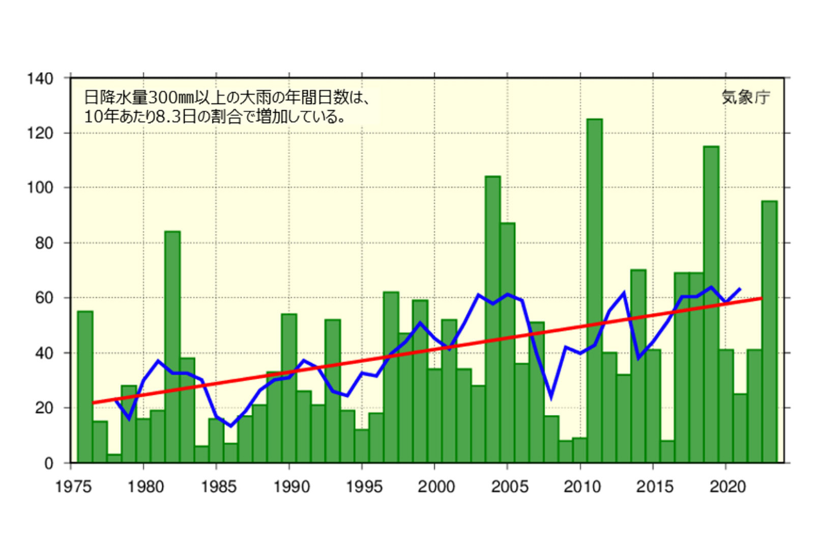中村さんによると、日本では極端な大雨の頻度が増加傾向にあるという。日降水量300mm以上の大雨の年間発生回数は、最近の10年は1980年頃と比べて約2.1倍になっている。温暖化による気温上昇と海面水温の上昇に伴って大気中の水蒸気量が長期的に増加傾向にあることが、背景要因ではないかと考えられている。