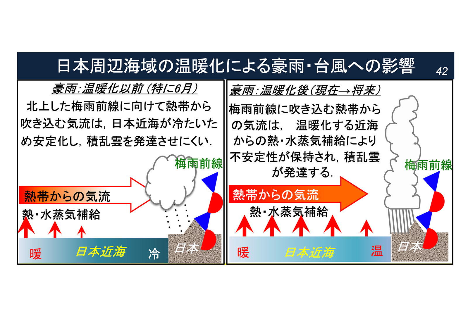 ところが、最近は日本近海の海水温が上がり、水蒸気を大量に含んだ熱帯からの気流があまり冷やされなくなった。そして不安定性を保った気流が山などにぶつかって持ち上げられると、たちまち積乱雲を発達させ、日本列島に大雨を降らせるようになってしまったのだ。