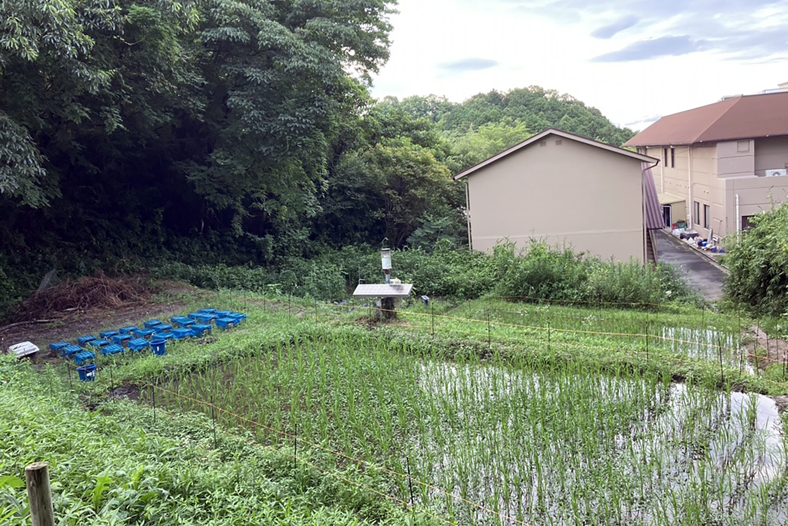 近畿大学奈良キャンパス内にニッポンバラタナゴが生息できる里山環境を北川さんが再現している。棚田をつくり、ため池、田んぼ、畑を一体的に運用しながら農作物を育てているのだが、棚田の最上部に位置するため池にはニッポンバラタナゴが自然繁殖し、そこには二枚貝とヨシノボリも一緒に生息している。