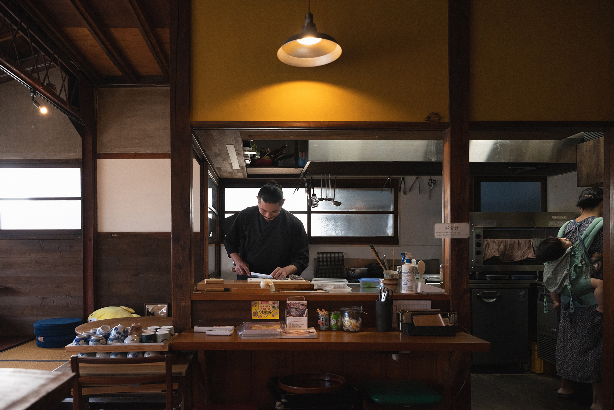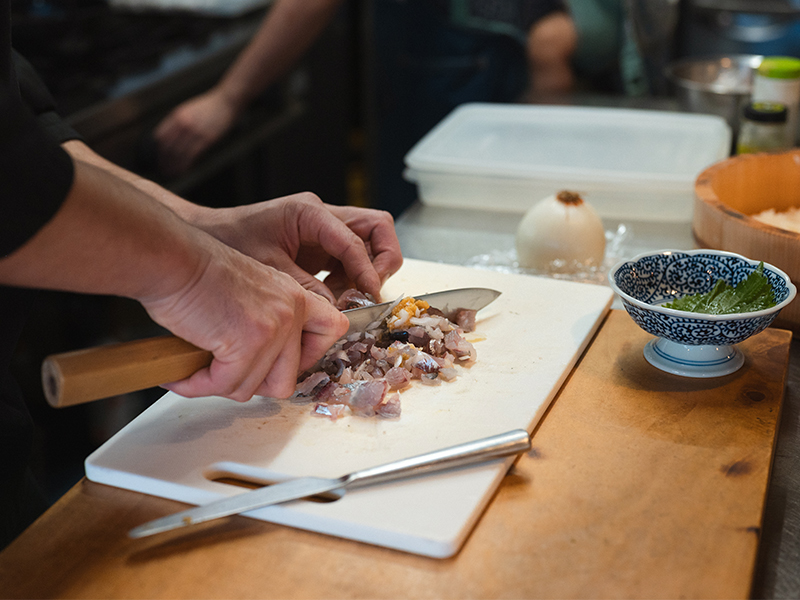 仕込みを終えてメインの厨房へ。なめろうは宮崎県の島野浦という離島の漁師料理からヒントを得たもの。麦味噌と刻んだ玉ねぎに柚子胡椒が加えられ、味も食感も複雑なテクスチャーを帯びる。こういった、漁師さんとの関係性の中で生まれていったレシピが多いという。