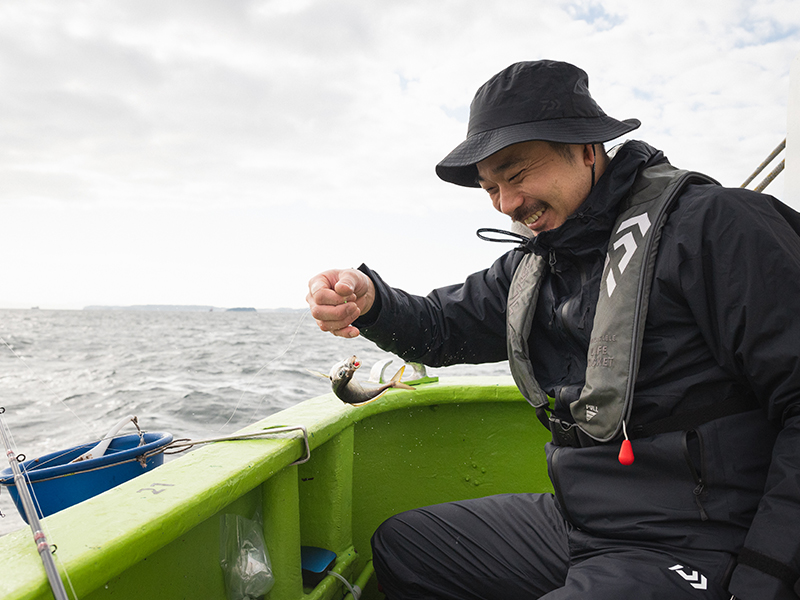 「Kai’s Kitchen」の店主・甲斐昂成さんは普段、漁師とともに船に乗り、二宮の定置網の水揚げに同行している。