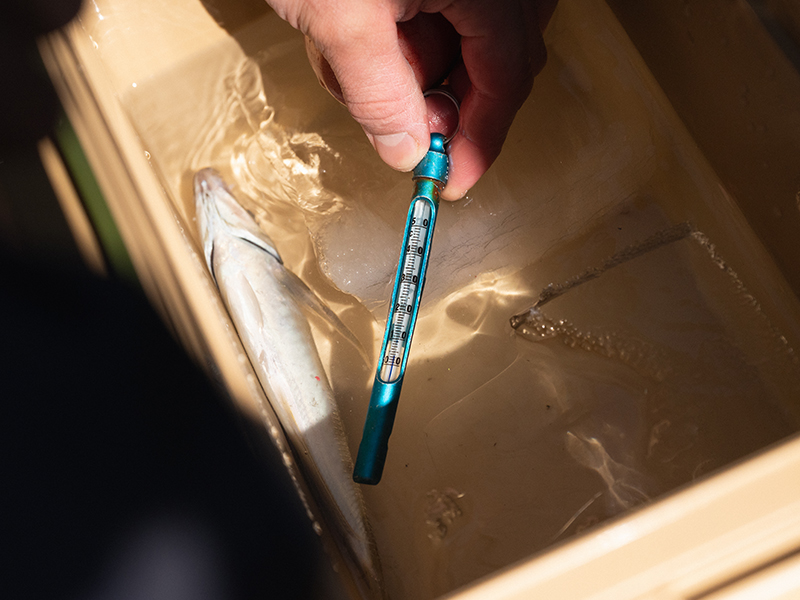 氷水の温度調整一つで魚の美味しさも変化していくのでシビアに管理していく。ただし、魚種や時期、個体差によって結果はケースバイケース。
