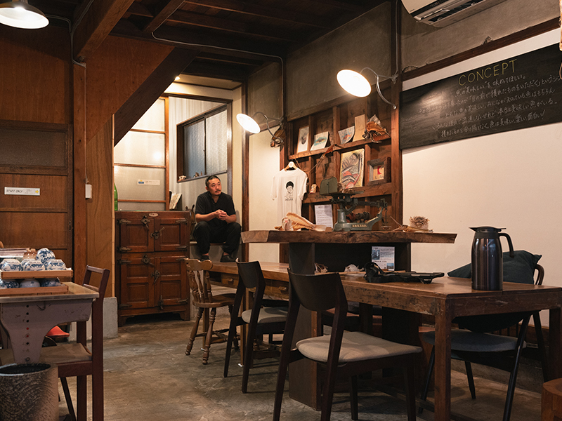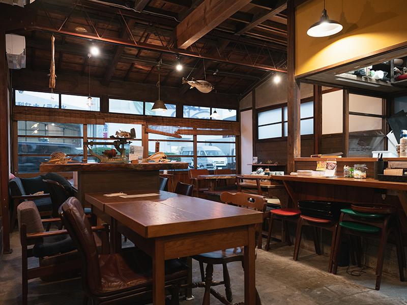 土間部分を利用して作られた店内。家具や調度品も古い建物にマッチしたレトロ風なものが多く、これらの多くも廃材や古い家具を利用したものだそうだ。