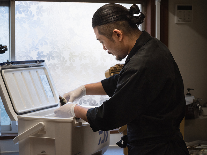 「うちみたいに前菜からメインまでメニューの構成で100%魚が出てくるコース料理のお店って多分ないと思うんです。他の魚を出すお料理屋さんよりも、仕込みには相当時間がかかってると思いますね。長い時だと、漁から帰ってきて朝6時から夕方の4時ぐらいまでやってるので10時間くらい。不思議とね、集中力が持つんですよ。」