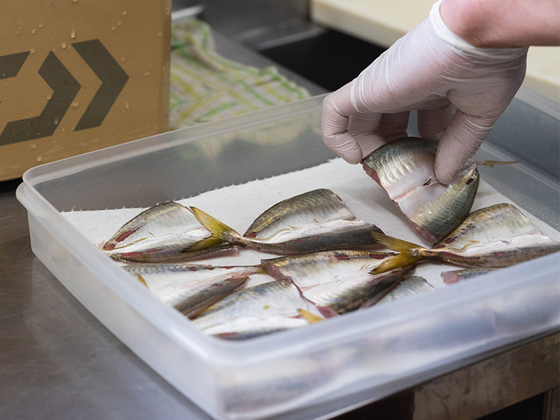 食材の仕込み用に使う奥の厨房で、先ほど獲れたアジを捌いていく。色々とインタビューしている間でも、手だけは淡々と動き、1匹ずつ丁寧に下ごしらえが進んでいく。