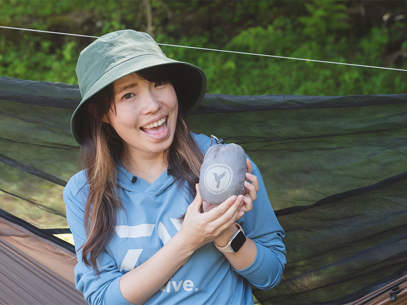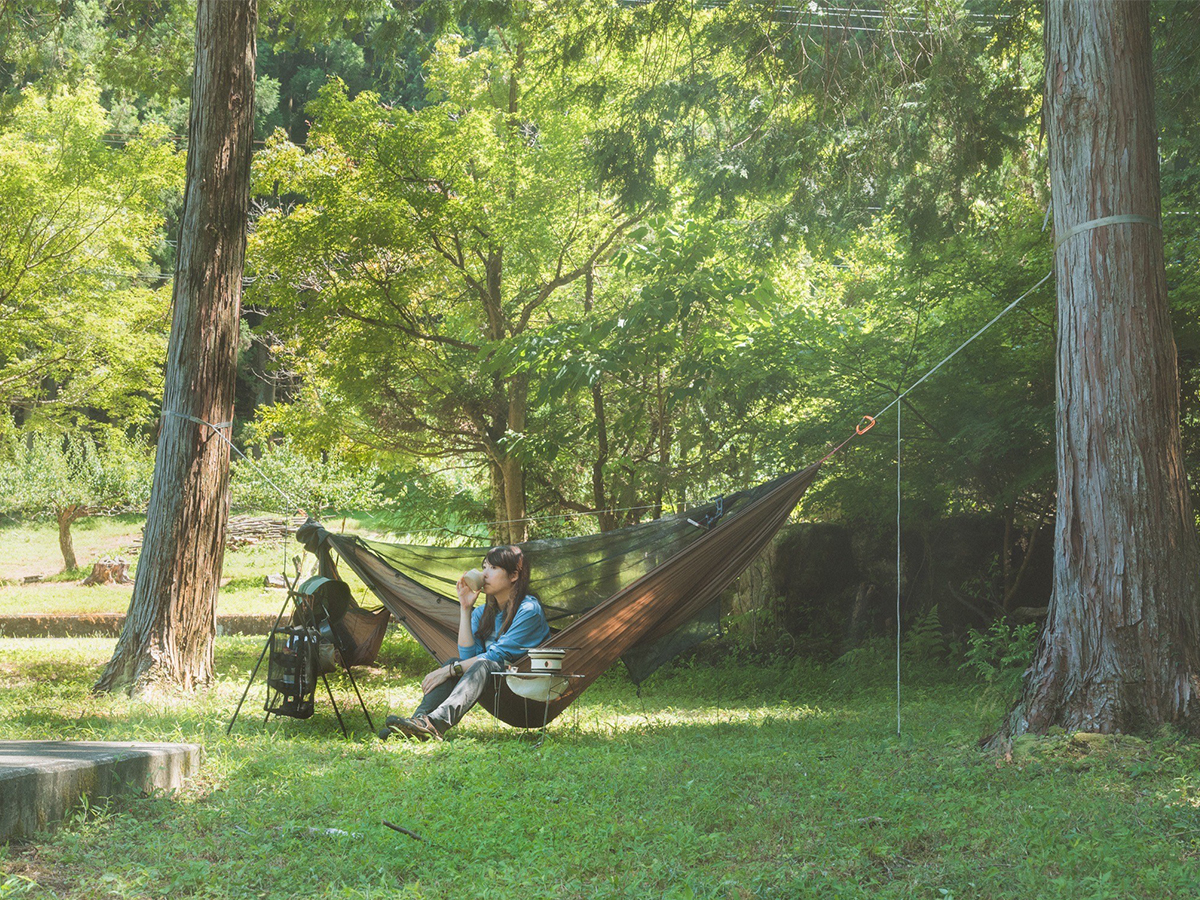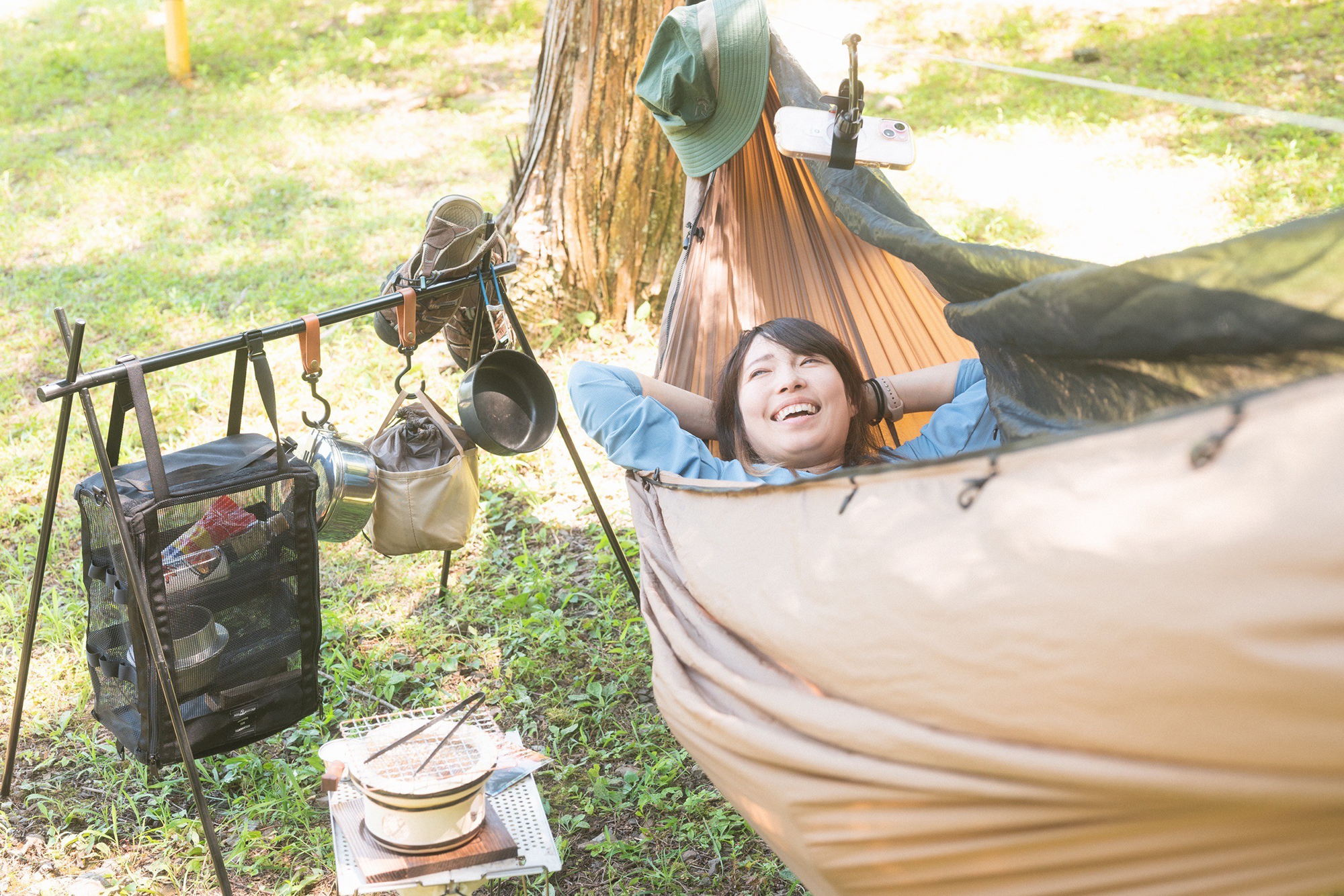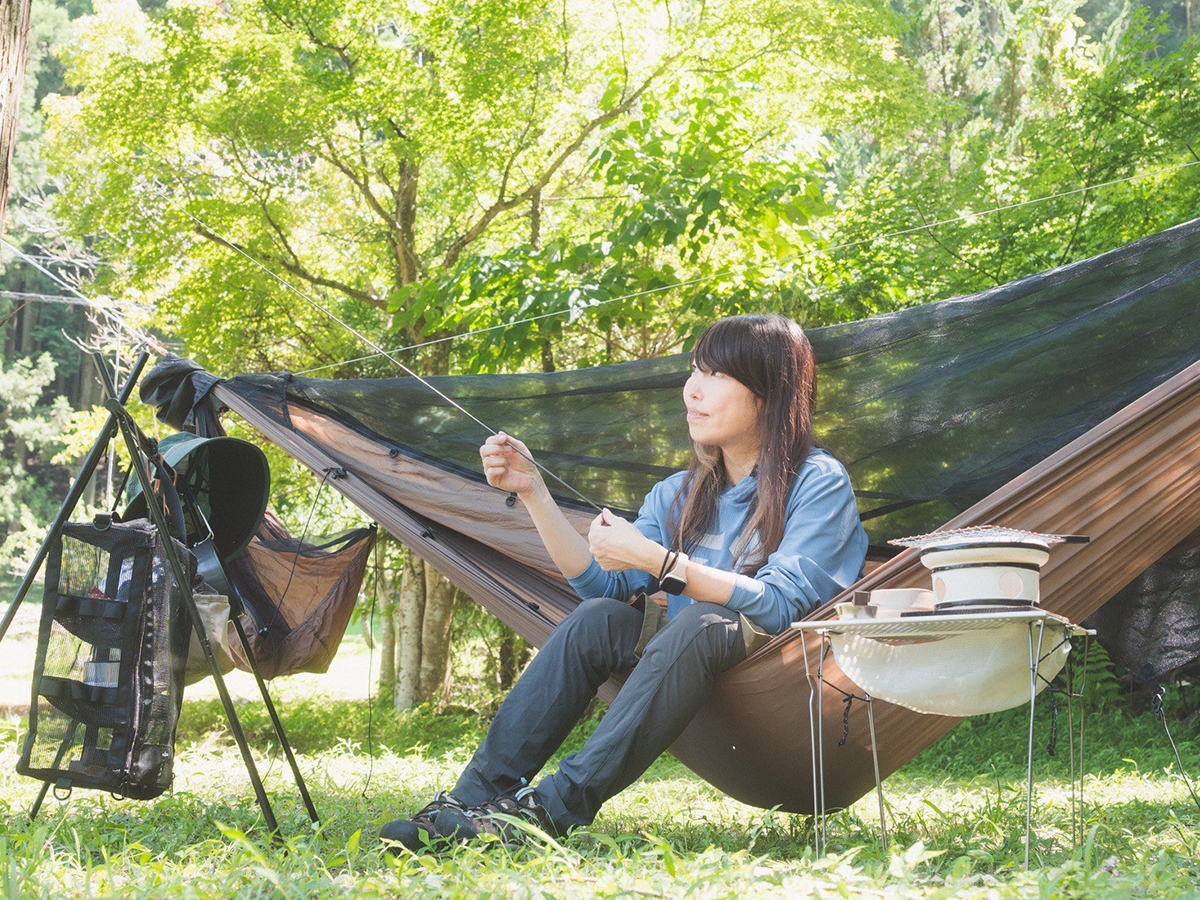 ある日、テントを持たずにハンモックだけでキャンプを楽しむ友人に出会い、設営から片付けのスムーズさに感動した野沢さん。「私が必死にテントを立てている間にコーヒーを楽しんでいるのを見て、大掛かりなキャンプでむだにしていた時間に気がついてしまって……」