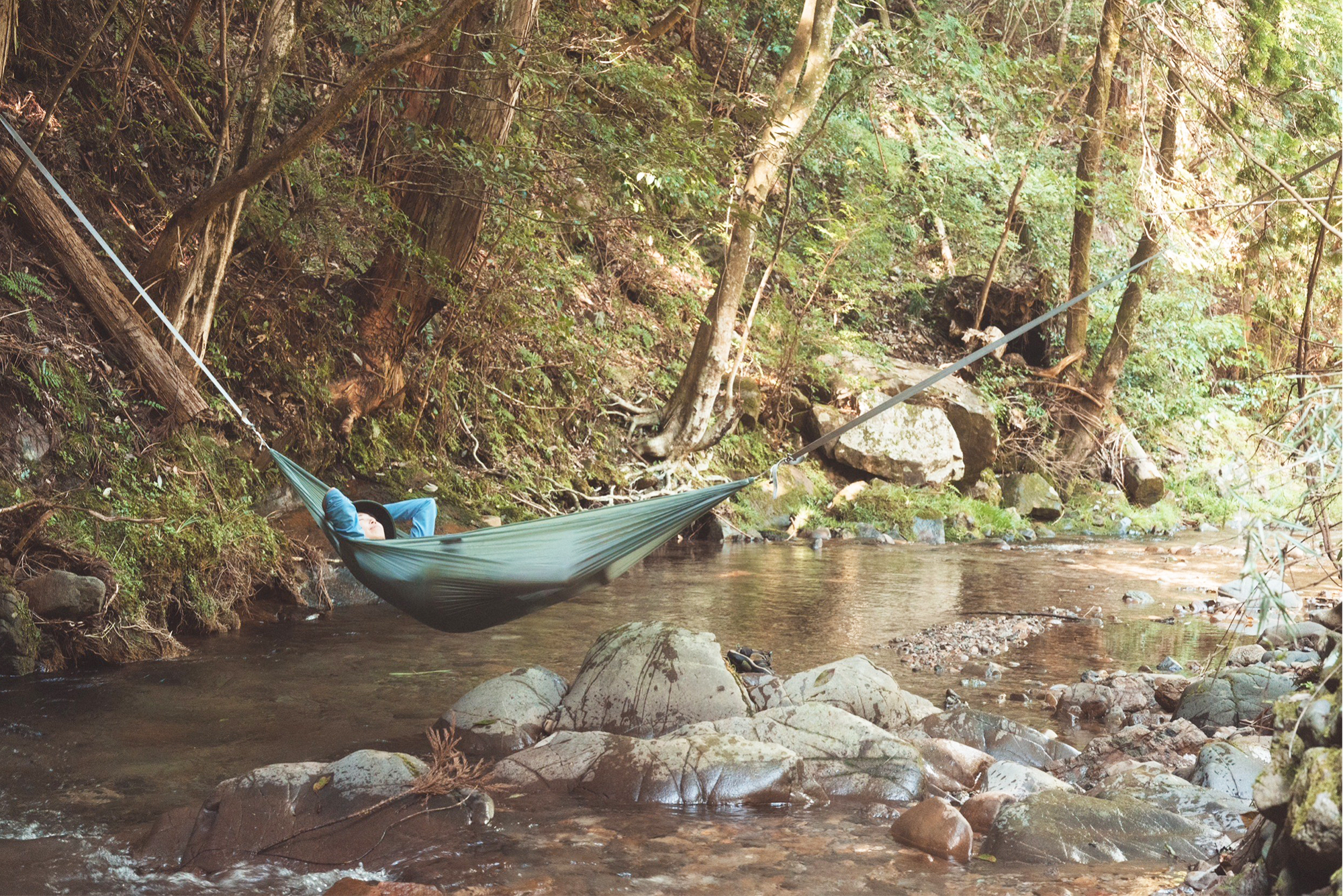 「木にツリーストラップ(※)を回してハンモックをかけるだけ。ほんの数分の設営で済んでしまうので、自然のなかでの自由時間が格段に増えました」