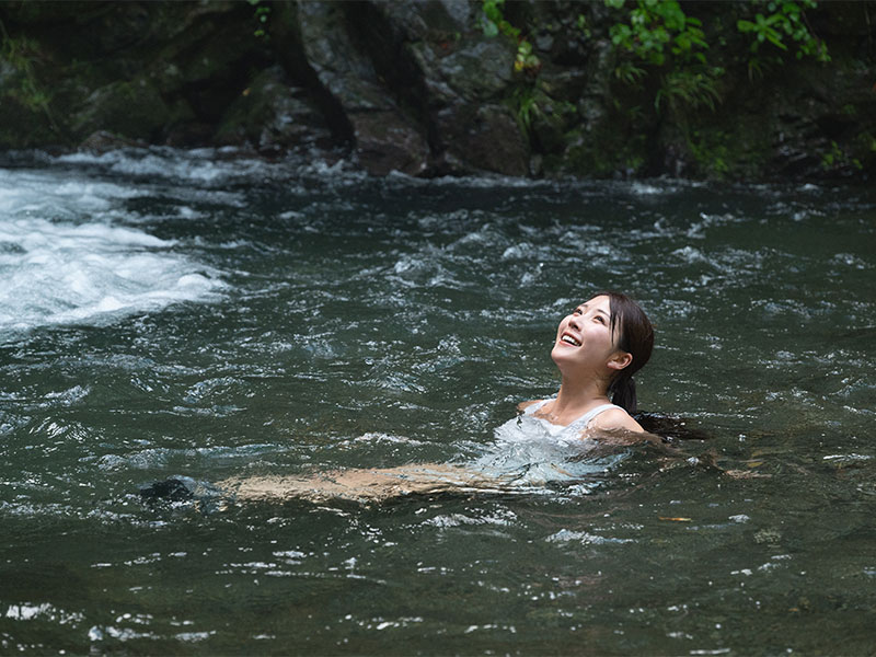 サウナ系インフルエンサーとして全国のサウナ情報を発信し、フリーランスのモデルとしても活躍する野添百華さんと訪れたのは、神流川とその源流が流れる群馬県上野村。関東一の清流で、イワナやヤマメ、鮎など多くの渓流魚が棲息する。
