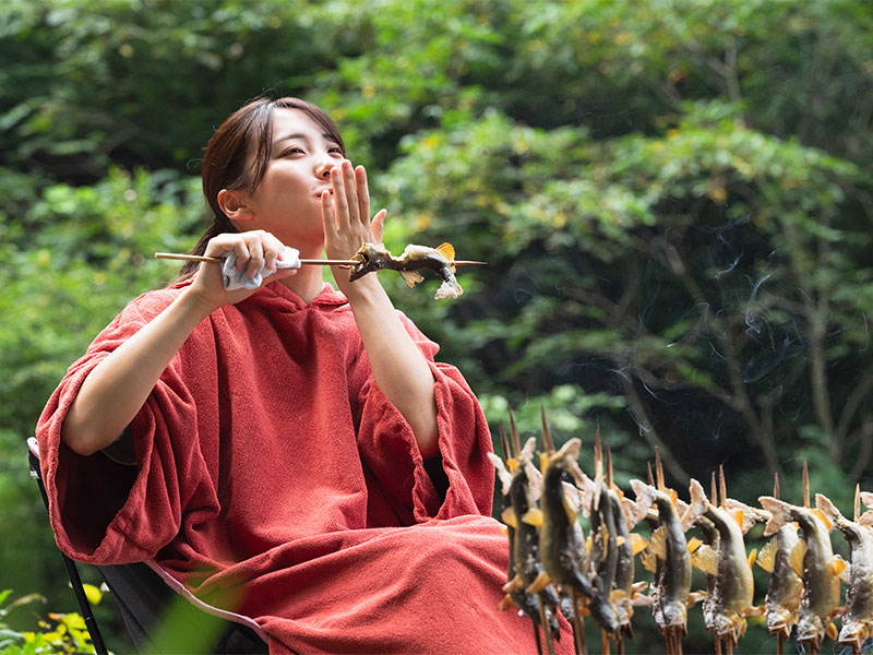サウナ上がりには流した汗の分、しっかりと塩分補給。炭火で焼いた鮎の塩焼きを頬張りながら自然のなかで過ごす時間が、日常からの解放と新たなエネルギーをもたらしてくれる。
