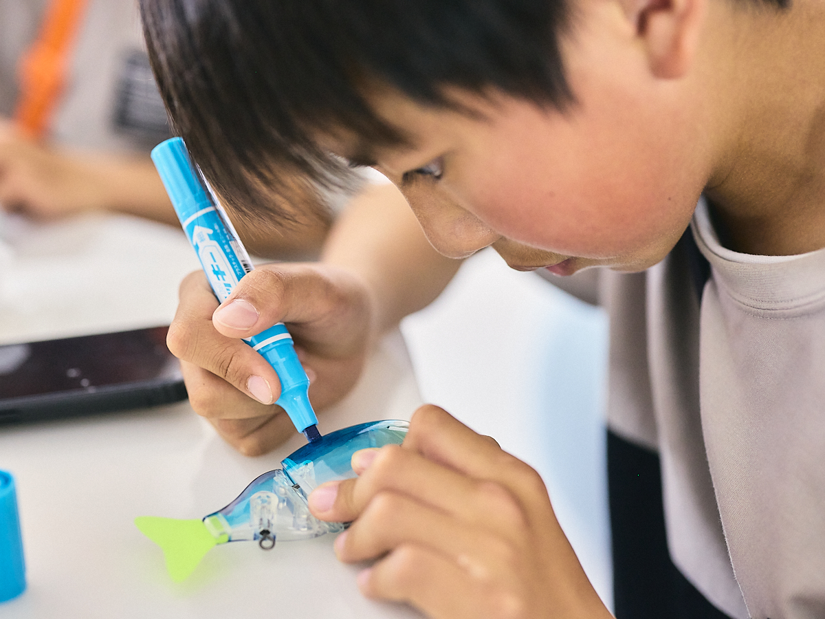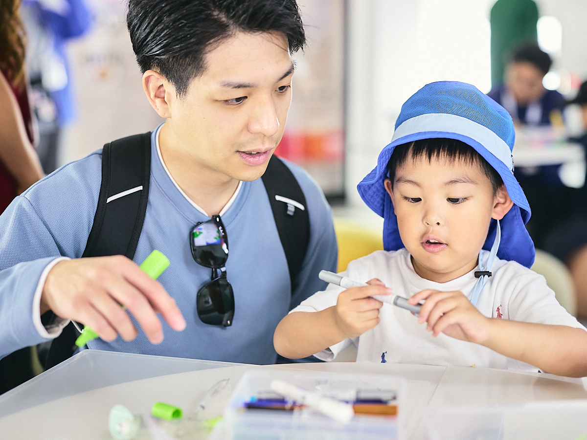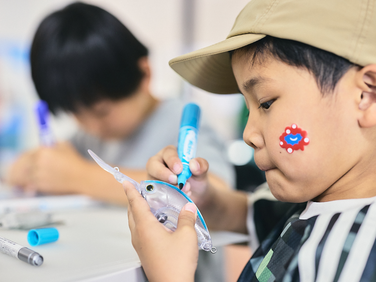 釣りを通して、身近な魚や水辺の生態から思考を広げ、地球環境とのつながりや理科的な視点にふれる──そんな「学びと発見」に満ちた、子ども参加型のワークショップ。会場では、目を輝かせながらルアーに色を塗る子どもたちの姿と、ひとりひとりに寄り添いながら、やさしく語りかける赤羽さんの姿がそこにあった。