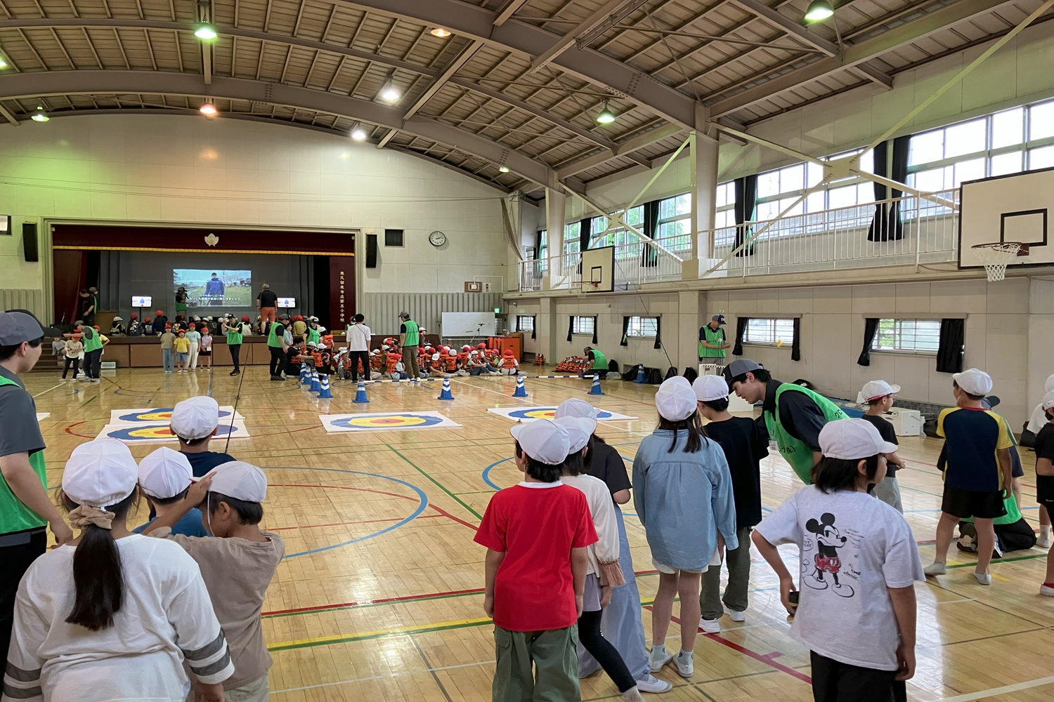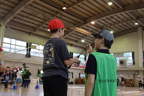 第二部の体験学習では、フローティングベスト試着・ラインノットの実技、釣りキャスティング体験、川のVTR講習を実施。特にキャスティング体験では、はじめはなかなか思うように投げられない子もいましたが、講師の手ほどきを受けて徐々にうまく投げられるようになり、子ども達の嬉しそうな表情を見ることができました。釣りの楽しさを知ってもらう機会を提供できたとともに、スタッフ自身も子ども達から元気をもらうことができました。