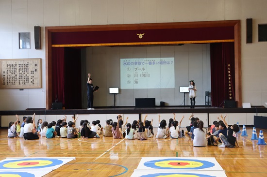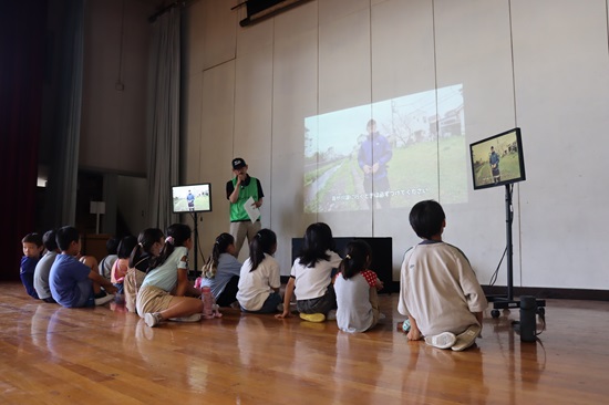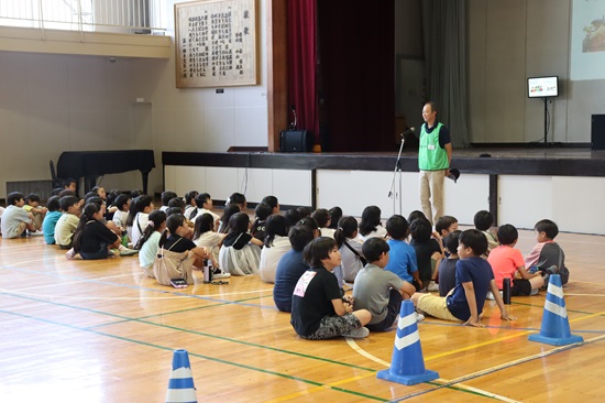東久留米市本村小学校にて、今年度2回目となる「釣り環境学習<座学編>」を開催しました。今回は3年生(約50名)が対象で、10月に予定している「落合川での実釣体験に向けた事前学習」という位置づけで行いました。保護者参観日ということもあり、子どもたちは緊張しつつも元気いっぱい!第一部の安全学習では、川の特性や水の事故の話を真剣に聞き、しっかりとリアクションしていました。