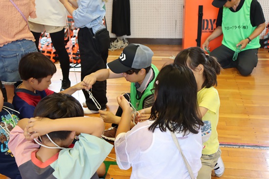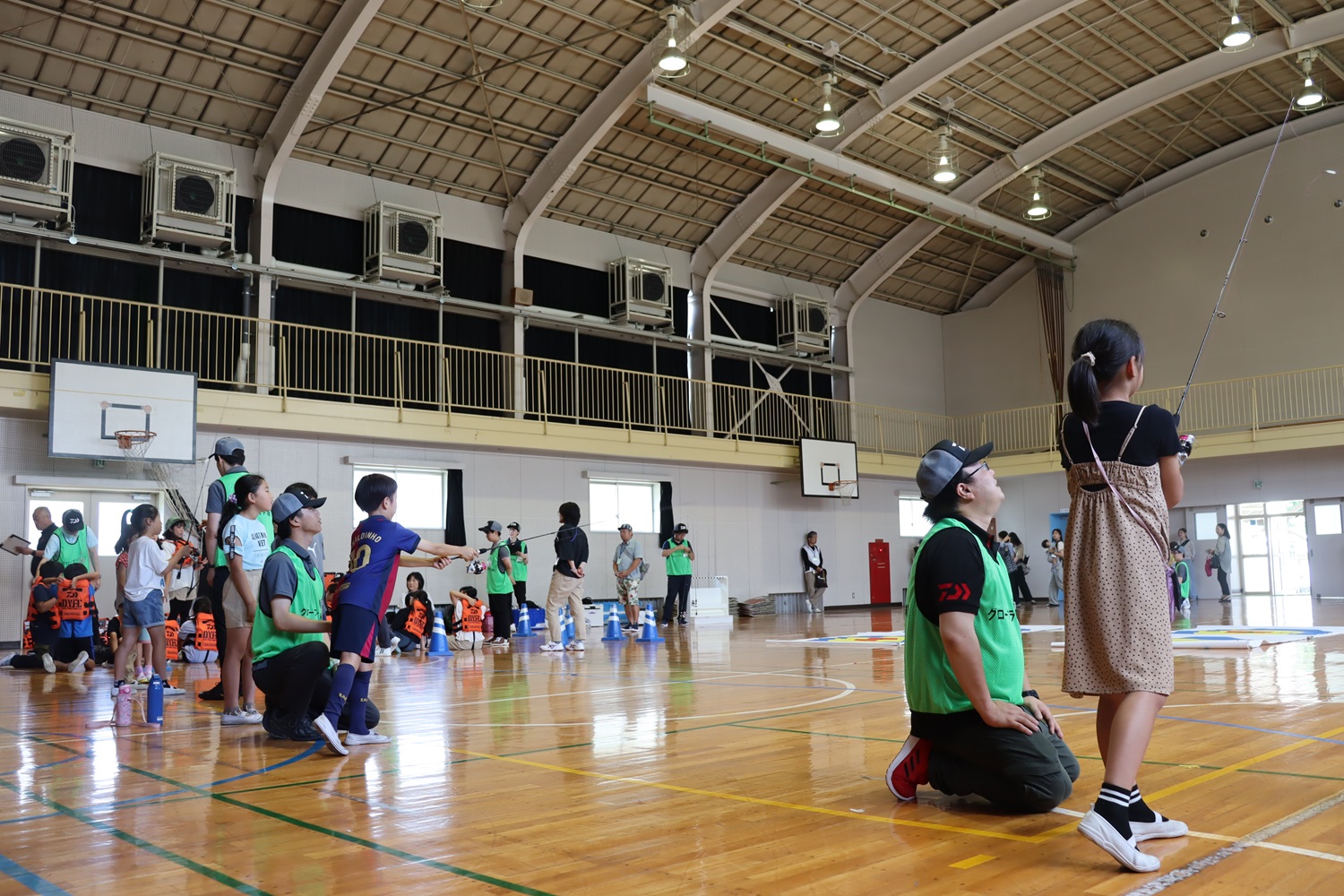 第二部の体験学習では、釣り未経験の子どもたちにも楽しんでもらえるよう、当社スタッフがインストラクターとして①キャスティング、②フローティングベスト着用/糸の結び方、③川釣りやガサガサのやり方を伝授。「これ合ってる?」「できた!」など、張り切って取り組む子どもたちの元気な声が所々に響き渡っていました。そのような姿に私たちスタッフも自然と笑顔が溢れ、うれしい気持ちになりました。