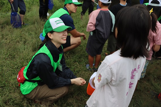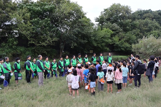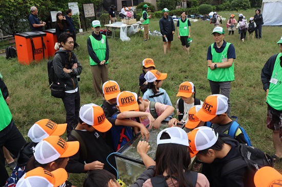 ガサガサ体験ではスッポンなどの珍しい生物をはじめ、多くの生物に触れていただくことができました。子どもたちは「これ僕が捕まえたんだよ!」「ザリガニ手で持てるよ!」と嬉しそうに話かけてくれ、生き生きとした表情がとても印象的でした。釣り体験では、残念ながら釣れなかった子どもたちもいましたが、釣れた魚を皆で観察したり、エサの赤虫に興味を示したりと、それぞれが自分なりの楽しみ方を見つけていました。みんなで捕まえた生物を大きな水槽に入れると、子どもたちが興味津々で観察する姿も見受けられました。体験終了後はスタッフから落合川の特徴や生態系の仕組みについて説明し、水辺環境や生態系の大切さを実感する良い機会となりました。