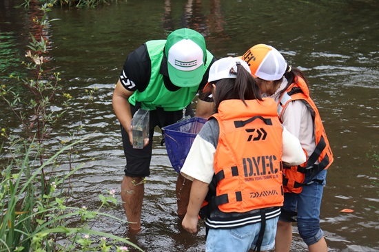 6月に開催した座学編に続く活動ということもあり、「お久しぶりです!」と元気に挨拶する子どもたちの登場からスタート。①ガサガサ体験と②釣り体験の2グループに分かれ、生徒2~3名に対してスタッフ1名が付き添う形で、前半・後半それぞれ30分ずつ交代しながら体験していただきました。