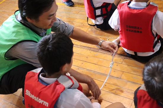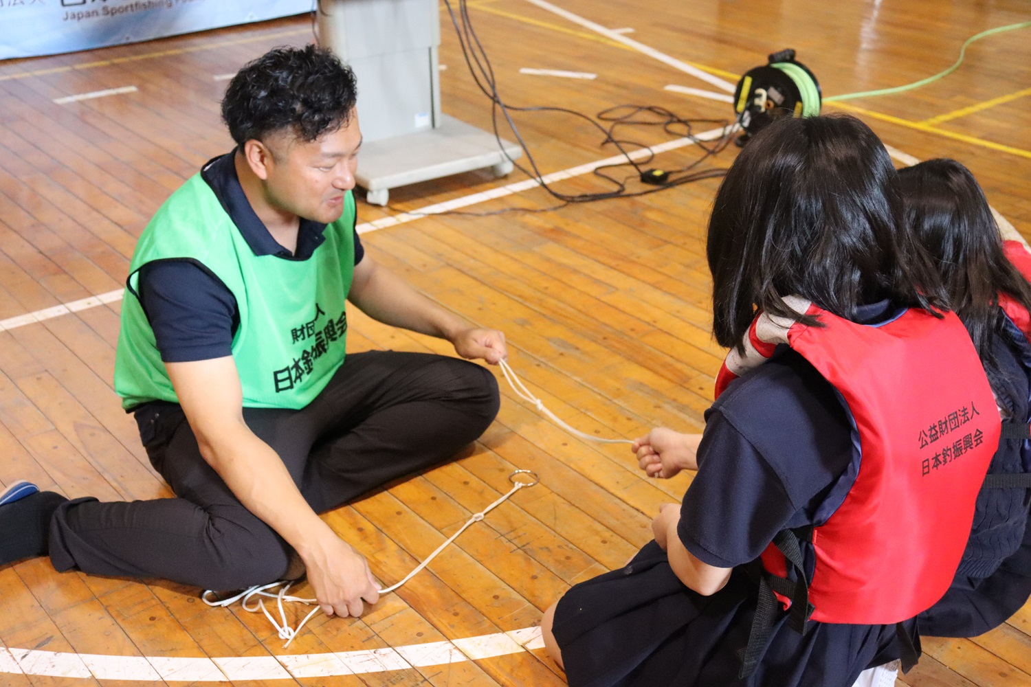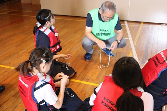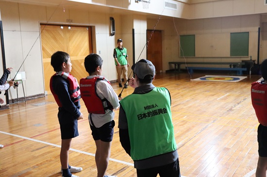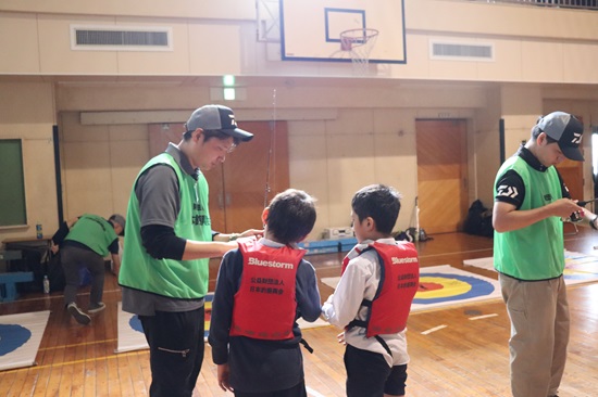釣り体験ができずに残念そうな子もいましたが、実際の釣行時と同じようにフローティングベストの着用や、糸の結び方(チチワ結び)、キャスティングを体験してもらいました。的に向かって思いっきりキャストする子や、友達同士で糸の結び方を教え合い楽しそうに取り組む姿を見て、スタッフもうれしい気持ちになりました。