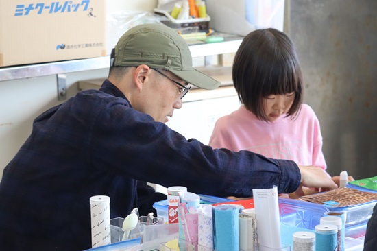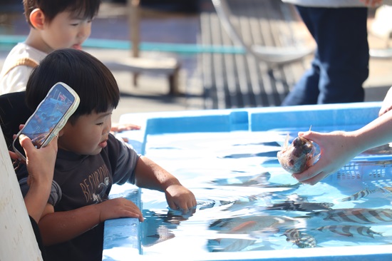 清掃活動後にはNPO法人江ノ島・フィッシャーマンズ・プロジェクト様主催のイベントを開催。タッチプールや魚のウロコを使った万華鏡作り、ミニクルージング、プラスチックゴミの解説、水中ドローン操作体験などさまざまなプログラムが用意されており、子どもたちが楽しそうに魚に触れたりスタッフの話に聞き入っている姿が印象的でした。また、海中清掃で回収されたゴミの展示では釣り糸やルアー・オモリなど釣りに関連したものも多く、普段は見えにくい釣りという遊びの負の側面を目の当たりにし、釣り具メーカーとして常に意識しておくべきだとの認識を新たにする機会でもありました。ゴミを拾って終わりの活動ではなく、江ノ島の海と生き物についてさまざまな視点から多角的に知ることができる充実した活動となりました。